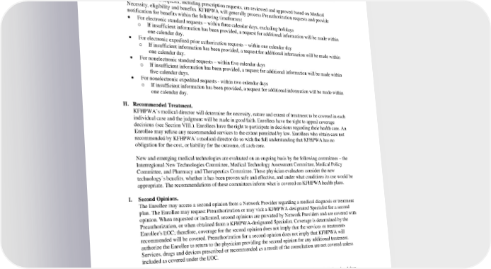 G. Preauthorization. Refer to Section IV. or call Member Services for more information regarding which services, equipment and facility types KFHPWA requires Preauthorization. Failure to obtain Preauthorization when required may result in denial of coverage for those services; and the Enrollee may be responsible for the cost of these non-Covered services. Enrollees may contact Member Services to request Preauthorization. Preauthorization requests, including prescription requests, are reviewed and approved based on Medical Necessity, eligibility and benefits. KFHPWA will generally process Preauthorization requests and provide notification for benefits within the following timeframes: • For electronic standard requests – within three calendar days, excluding holidays o If insufficient information has been provided, a request for additional information will be made within one calendar day. • For electronic expedited prior authorization requests – within one calendar day o If insufficient information has been provided, a request for additional information will be made within one calendar day. • For nonelectronic standard requests – within five calendar days o If insufficient information has been provided, a request for additional information will be made within five calendar days. • For nonelectronic expedited requests - within two calendar days o If insufficient information has been provided, a request for additional information will be made within one calendar day. H. Recommended Treatment. KFHPWA’s medical director will determine the necessity, nature and extent of treatment to be covered in each individual case and the judgment will be made in good faith. Enrollees have the right to appeal coverage decisions (see Section VIII.). Enrollees have the right to participate in decisions regarding their health care. An Enrollee may refuse any recommended services to the extent permitted by law. Enrollees who obtain care not recommended by KFHPWA’s medical director do so with the full understanding that KFHPWA has no obligation for the cost, or liability for the outcome, of such care. New and emerging medical technologies are evaluated on an ongoing basis by the following committees – the Interregional New Technologies Committee, Medical Technology Assessment Committee, Medical Policy Committee, and Pharmacy and Therapeutics Committee. These physician evaluators consider the new technology’s benefits, whether it has been proven safe and effective, and under what conditions its use would be appropriate. The recommendations of these committees inform what is covered on KFHPWA health plans. I. Second Opinions. The Enrollee may access a second opinion from a Network Provider regarding a medical diagnosis or treatment plan. The Enrollee may request Preauthorization or may visit a KFHPWA-designated Specialist for a second opinion. When requested or indicated, second opinions are provided by Network Providers and are covered with Preauthorization, or when obtained from a KFHPWA-designated Specialist. Coverage is determined by the Enrollee's EOC; therefore, coverage for the second opinion does not imply that the services or treatments recommended will be covered. Preauthorization for a second opinion does not imply that KFHPWA will authorize the Enrollee to return to the physician providing the second opinion for any additional treatment. Services, drugs and devices prescribed or recommended as a result of the consultation are not covered unless included as covered under the EOC. J. Unusual Circumstances. In the event of unusual circumstances such as a major disaster, epidemic, military action, civil disorder, labor disputes or similar causes, KFHPWA will not be liable for administering coverage beyond the limitations of available personnel and facilities. In the event of unusual circumstances such as those described above, KFHPWA will make a good faith effort to arrange for Covered Services through available Network Facilities and personnel. KFHPWA shall have no other liability or obligation if Covered Services are delayed or unavailable due to unusual circumstances. PEBB_CA_2024 10