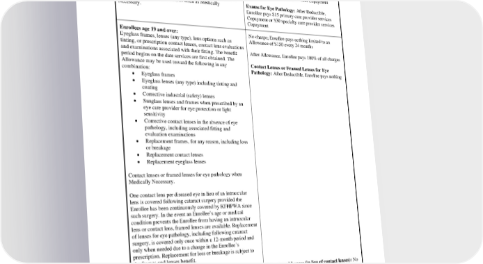 Optical (vision) Routine eye examinations and refractions, limited to once Routine Exams: After Deductible, Enrollee pays every 12 months. $15 primary care provider services Copayment or $30 specialty care provider services Copayment Eye and contact lens examinations for eye pathology and to monitor Medical Conditions, as often as Medically Exams for Eye Pathology: After Deductible, Necessary. Enrollee pays $15 primary care provider services Copayment or $30 specialty care provider services Copayment Enrollees age 19 and over: No charge; Enrollee pays nothing limited to an Eyeglass frames, lenses (any type), lens options such as Allowance of $150 every 24 months tinting, or prescription contact lenses, contact lens evaluations and examinations associated with their fitting. The benefit After Allowance, Enrollee pays 100% of all charges period begins on the date services are first obtained. The Allowance may be used toward the following in any Contact Lenses or Framed Lenses for Eye combination: Pathology: After Deductible, Enrollee pays nothing • Eyeglass frames • Eyeglass lenses (any type) including tinting and coating • Corrective industrial (safety) lenses • Sunglass lenses and frames when prescribed by an eye care provider for eye protection or light sensitivity • Corrective contact lenses in the absence of eye pathology, including associated fitting and evaluation examinations • Replacement frames, for any reason, including loss or breakage • Replacement contact lenses • Replacement eyeglass lenses Contact lenses or framed lenses for eye pathology when Medically Necessary. One contact lens per diseased eye in lieu of an intraocular lens is covered following cataract surgery provided the Enrollee has been continuously covered by KFHPWA since such surgery. In the event an Enrollee’s age or medical condition prevents the Enrollee from having an intraocular lens or contact lens, framed lenses are available. Replacement of lenses for eye pathology, including following cataract surgery, is covered only once within a 12-month period and only when needed due to a change in the Enrollee’s prescription. Replacement for loss or breakage is subject to the frames and lenses benefit. Enrollees to age 19: Frames and Lenses (in lieu of contact lenses): No Eyeglass frames, lenses (any type), lens options such as charge; Enrollee pays nothing for 1 set of frames and tinting, or prescription contact lenses, contact lens evaluations lenses per calendar year and examinations associated with their fitting. The benefit period begins on January 1 and continues through the end of Contact lenses (in lieu of eyeglasses): Enrollee the calendar year. The benefit may be used toward contact pays 50% coinsurance for a one-year supply PEBB_CA_2024 34