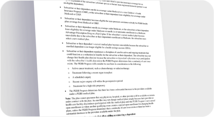 • Subscriber or their dependent has a change in residence that affects health plan availability. If the subscriber has a change in residence and their current medical plan is no longer available , the subscriber must select a new medical plan as described in PEBB Program rules. If the subscriber does not elect a new medical plan as required, they will be enrolled in a PEBB medical plan designated by the director of HCA or their designee. • A court order requires the subscriber or any other individual to provide insurance coverage for an eligible dependent of the subscriber (a former spouse or former state-registered domestic partner is not an eligible dependent). • Subscriber or their dependent enrolls in coverage under Medicaid or a state Children’s Health Insurance Program (CHIP), or the subscriber or their dependent loses eligibility for coverage under Medicaid or CHIP. • Subscriber or their dependent becomes eligible for state premium assistance subsidy for PEBB health plan coverage from Medicaid or CHIP. • Subscriber or their dependent enrolls in coverage under Medicare, or the subscriber or their dependent loses eligibility for coverage under Medicare or enrolls in or terminates enrollment in a Medicare Advantage-Prescription Drug or a Part D plan. If the subscriber’s current medical plan becomes unavailable due to the subscriber or their dependents enrollment in Medicare, the subscriber must select a new medical plan. • Subscriber or their dependent’s current medical plan becomes unavailable because the subscriber or enrolled dependent is no longer eligible for a health savings account (HSA). • Subscriber or their dependent experiences a disruption of care for active and ongoing treatment that could function as a reduction in benefits for the subscriber or their dependent. The subscriber may not change their health plan election because the subscriber or dependent’s physician stops participation with the subscriber’s health plan unless the PEBB Program determines that a continuity of care issue exists. The PEBB Program will consider but not limit its consideration to the following: o Active cancer treatment, such as chemotherapy or radiation therapy o Treatment following a recent organ transplant o A scheduled surgery o Recent major surgery still within the postoperative period o Treatment for a high-risk pregnancy • The PEBB Program determines that there has been a substantial decrease in the providers available under a PEBB medical plan. Note: The plan cannot guarantee that any physician, hospital, or other provider will be available or remain under contract with the plan. An enrollee may not change medical plans simply because their provider or health care facility discontinues participation with this medical plan until the PEBB Program’s next annual open enrollment or when another qualifying event creates a special open enrollment for changing health plans, unless the PEBB Program determines that a continuity of care issue exists or there has been a substantial decrease in the providers available under the plan. 7. Special open enrollment events that allow adding or removing a dependent Any of the following events may create a special open enrollment: • Subscriber gains a new dependent due to: o Marriage or registering a state-registered domestic partnership. o Birth, adoption, or when the subscriber has assumed a legal obligation for total or partial support in anticipation of adoption. PEBB_CA_2024 56