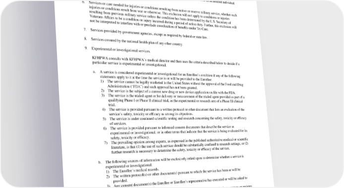 5. Services to the extent benefits are “available” to the Enrollee as defined herein under the terms of any vehicle, homeowner’s, property or other insurance policy, except for individual or group health insurance, pursuant to medical coverage, medical “no fault” coverage, personal injury protection coverage or similar medical coverage contained in said policy. For the purpose of this exclusion, benefits shall be deemed to be “available” to the Enrollee if the Enrollee receives benefits under the policy either as a named insured or as an insured individual under the policy definition of insured. 6. Services or care needed for injuries or conditions resulting from active or reserve military service, whether such injuries or conditions result from war or otherwise. This exclusion will not apply to conditions or injuries resulting from previous military service unless the condition has been determined by the U.S. Secretary of Veterans Affairs to be a condition or injury incurred during a period of active duty. Further, this exclusion will not be interpreted to interfere with or preclude coordination of benefits under Tri-Care. 7. Services provided by government agencies, except as required by federal or state law. 8. Services covered by the national health plan of any other country. 9. Experimental or investigational services. KFHPWA consults with KFHPWA’s medical director and then uses the criteria described below to decide if a particular service is experimental or investigational. a. A service is considered experimental or investigational for an Enrollee’s condition if any of the following statements apply to it at the time the service is or will be provided to the Enrollee: 1) The service cannot be legally marketed in the United States without the approval of the Food and Drug Administration (“FDA”) and such approval has not been granted. 2) The service is the subject of a current new drug or new device application on file with the FDA. 3) The service is the trialed agent or for delivery or measurement of the trialed agent provided as part of a qualifying Phase I or Phase II clinical trial, as the experimental or research arm of a Phase III clinical trial. 4) The service is provided pursuant to a written protocol or other document that lists an evaluation of the service’s safety, toxicity or efficacy as among its objectives. 5) The service is under continued scientific testing and research concerning the safety, toxicity or efficacy of services. 6) The service is provided pursuant to informed consent documents that describe the service as experimental or investigational, or in other terms that indicate that the service is being evaluated for its safety, toxicity or efficacy. 7) The prevailing opinion among experts, as expressed in the published authoritative medical or scientific literature, is that (1) the use of such service should be substantially confined to research settings, or (2) further research is necessary to determine the safety, toxicity or efficacy of the service. b. The following sources of information will be exclusively relied upon to determine whether a service is experimental or investigational: 1) The Enrollee’s medical records. 2) The written protocol(s) or other document(s) pursuant to which the service has been or will be provided. 3) Any consent document(s) the Enrollee or Enrollee’s representative has executed or will be asked to execute, to receive the service. 4) The files and records of the Institutional Review Board (IRB) or similar body that approves or reviews research at the institution where the service has been or will be provided, and other information concerning the authority or actions of the IRB or similar body. 5) The published authoritative medical or scientific literature regarding the service, as applied to the Enrollee’s illness or injury. PEBB_CA_2024 46