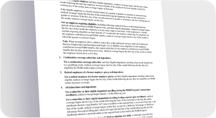 Medicare may be delayed. If enrollment in Medicare does not occur when the subscriber or their dependent is first eligible, a late enrollment penalty may apply. D. When Medical Coverage Begins. 1. Employees and dependents For a newly eligible employee and their eligible dependents, medical coverage begins the first day of the month following the date the employee becomes eligible. If the employee becomes eligible on the first working day of the month, then coverage begins on that date. If the eligible employee is a faculty member hired on a quarter-to-quarter or semester-to-semester basis, medical coverage begins the first day of the month following the beginning of the second consecutive quarter or semester. If the first day of the second consecutive quarter or semester is the first working day of the month, medical coverage begins on that day. For an employee regaining eligibility, including following a period of leave or after being between periods of leave described in PEBB Program rules, and their eligible dependents, medical coverage begins the first day of the month the employee is in pay status eight or mor hours. If the employee is a faculty th member regaining eligibility no later than the 12 month after the month in which they lost eligibility for the employer contribution toward PEBB benefits, medical coverage begins the first day of the month in which the quarter or semester begins. Note: When an employee who is called to active duty in the uniformed services under the Uniformed Services Employment and Reemployment Rights Act (USERRA) loses eligibility for the employer contribution toward PEBB benefits, they regain eligibility for the employer contribution toward PEBB benefits the day they return from active duty. Medical coverage begins the first day of the month in which the employee returns from active duty. 2. Continuation coverage subscriber and dependents For a continuation coverage subscriber and their eligible dependents enrolling when newly eligible due to a qualifying event, medical coverage begins the first day of the month following the day they lost eligibility for PEBB medical plan coverage. 3. Retired employees of a former employer group and dependents For a retired employee of a former employer group and their eligible dependents enrolling when newly eligible, medical coverage begins the first day of the month following the day they lost eligibility for PEBB retiree insurance coverage. 4. All Subscribers and dependents For a subscriber or their eligible dependents enrolling during the PEBB Program’s annual open enrollment, medical coverage begins January 1 of the following year. For a subscriber or their eligible dependents enrolling during a special open enrollment, medical coverage begins the first day of the month following the later of the event date or the date the online enrollment election using Benefits 24/7 (once available) or the required form is received. If that day is the first of the month, medical coverage begins on that day, except for a Medicare Advantage or Medicare Advantage Prescription Drug plan, which will begin the first day of the month following the date the enrollment election is received online or the required form is received by the PEBB Program. If the special open enrollment is due to the birth or adoption of a child, or when the subscriber has assumed a legal obligation for total or partial support in anticipation of adoption of a child, medical coverage will begin as follows: • For an employee, medical coverage will begin the first day of the month in which the event occurs. • For a newly born child, medical coverage will begin the date of birth. PEBB_CA_2024 52