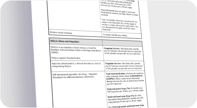 Preferred brand name drugs (Tier 2): After Prescription Drug Deductible, Enrollee pays $40 Copayment per 30-days up to a 90-day supply Non-Preferred generic and brand name drugs (Tier 3): After Prescription Drug Deductible, Enrollee pays 50% coinsurance up to $250 maximum per 30-days up to a 90-day supply Annual Deductible does not apply to strip-based blood glucose monitors, test strips, lancets or control solutions. Note: An Enrollee will not pay more than $35, not subject to the Deductible, for a 30-day supply of insulin to comply with state law requirements. Any cost sharing paid will apply toward the annual Deductible. Diabetic retinal screening. No charge; Enrollee pays nothing Dialysis (Home and Outpatient) Dialysis in an outpatient or home setting is covered for Outpatient Services: After Deductible, Enrollee Enrollees with acute kidney failure or end-stage renal disease pays $15 primary care provider services Copayment (ESRD). or $30 specialty care provider services Copayment Dialysis requires Preauthorization. Injections administered by a Network Provider in a clinical Outpatient Services: After Deductible, Enrollee setting during dialysis. pays $15 primary care provider services Copayment or $30 specialty care provider services Copayment Self-administered injectables. See Drugs – Outpatient Value based medications which provide significant Prescription for additional pharmacy information. value in treating chronic disease as determined by KFHPWA (Please contact Kaiser Permanente Member Services for a list of medications): Enrollee pays $5 Copayment Preferred generic drugs (Tier 1): Enrollee pays $20 Copayment per 30-days up to a 90-day supply Preferred brand name drugs (Tier 2): After Prescription Drug Deductible, Enrollee pays $40 Copayment per 30-days up to a 90-day supply Non-Preferred generic and brand name drugs (Tier 3): After Prescription Drug Deductible, Enrollee pays 50% coinsurance up to $250 maximum per 30-days up to a 90-day supply PEBB_CA_2024 19