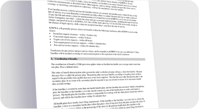 A request for a review by an independent review organization must be made within 180 days after the date of the initial appeal decision notice. IX. Claims Claims for benefits may be made before or after services are obtained. KFHPWA recommends that the provider requests Preauthorization. In most instances, contracted providers submit claims directly to KFHPWA. If your provider does not submit a claim to make a claim for benefits, an Enrollee must contact Member Services, or submit a claim for reimbursement as described below. Other inquiries, such as asking a health care provider about care or coverage, or submitting a prescription to a pharmacy, will not be considered a claim for benefits. If an Enrollee receives a bill for services the Enrollee believes are covered, the Enrollee must, within 90 days of the date of service, or as soon thereafter as reasonably possible, either (1) contact Member Services to make a claim or (2) pay the bill and submit a claim for reimbursement of Covered Services to KFHPWA, or (3) for out-of-country claims (Emergency care only) – submit the claim and any associated medical records , including the type of service, charges, and proof of travel to KFHPWA, P.O. Box 30766, Salt Lake City, UT 84130-0766. In no event, except in the absence of legal capacity, shall a claim be accepted later than 1 year from the date of service. KFHPWA will generally process claims for benefits within the following timeframes after KFHPWA receives the claims: • Immediate request situations – within 1 business day. • Concurrent urgent requests – within 24 hours. • Urgent care review requests – within 48 hours. • Non-urgent preservice review requests – within 5 calendar days. • Post-service review requests – within 30 calendar days. Timeframes for pre-service and post-service claims can be extended by KFHPWA for up to an additional 15 days. Enrollee will be notified in writing of such extension prior to the expiration of the initial timeframe. X. Coordination of Benefits The coordination of benefits (COB) provision applies when an Enrollee has health care coverage under more than one plan. Plan is defined below. The order of benefit determination rules govern the order in which each plan will pay a claim for benefits. The plan that pays first is called the primary plan. The primary plan must pay benefits according to its policy terms without regard to the possibility that another plan may cover some expenses. The plan that pays after the primary plan is the secondary plan. In no event will a secondary plan be required to pay an amount in excess of its maximum benefit plus accrued savings. If the Enrollee is covered by more than one health benefit plan, and the Enrollee does not know which is the primary plan, the Enrollee or the Enrollee’s provider should contact any one of the health plans to verify which plan is primary. The health plan the Enrollee contacts is responsible for working with the other plan to determine which is primary and will let the Enrollee know within 30 calendar days. All health plans have timely claim filing requirements. If the Enrollee or the Enrollee’s provider fails to submit the Enrollee’s claim to a secondary health plan within that plan’s claim filing time limit, the plan can deny the claim. If the Enrollee experiences delays in the processing of the claim by the primary health plan, the Enrollee or the Enrollee’s provider will need to submit the claim to the secondary health plan within its claim filing time limit to prevent a denial of the claim. If the Enrollee is covered by more than one health benefit plan, the Enrollee or the Enrollee’s provider should file all the Enrollee’s claims with each plan at the same time. If Medicare is the Enrollee’s primary plan, Medicare may submit the Enrollee’s claims to the Enrollee’s secondary carrier. PEBB_CA_2024 64