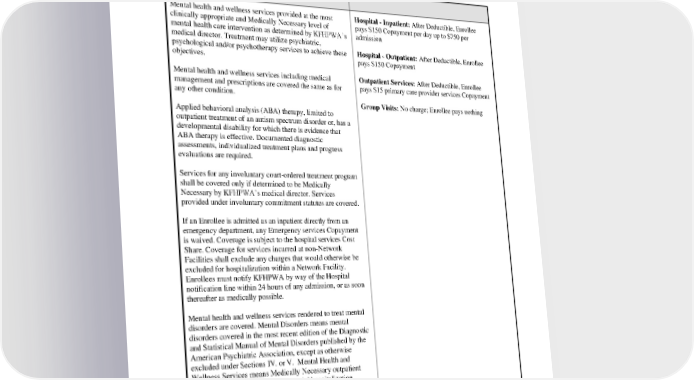 Outpatient Services: Enrollee pays nothing Exclusions: Birthing tubs; genetic testing of non-Enrollees; fetal ultrasound not considered Medically Necessary Mental Health and Wellness Mental health and wellness services provided at the most Hospital - Inpatient: After Deductible, Enrollee clinically appropriate and Medically Necessary level of pays $150 Copayment per day up to $750 per mental health care intervention as determined by KFHPWA’s admission medical director. Treatment may utilize psychiatric, psychological and/or psychotherapy services to achieve these Hospital - Outpatient: After Deductible, Enrollee objectives. pays $150 Copayment Mental health and wellness services including medical Outpatient Services: After Deductible, Enrollee management and prescriptions are covered the same as for pays $15 primary care provider services Copayment any other condition. Group Visits: No charge; Enrollee pays nothing Applied behavioral analysis (ABA) therapy, limited to outpatient treatment of an autism spectrum disorder or, has a developmental disability for which there is evidence that ABA therapy is effective. Documented diagnostic assessments, individualized treatment plans and progress evaluations are required. Services for any involuntary court-ordered treatment program shall be covered only if determined to be Medically Necessary by KFHPWA’s medical director. Services provided under involuntary commitment statutes are covered. If an Enrollee is admitted as an inpatient directly from an emergency department, any Emergency services Copayment is waived. Coverage is subject to the hospital services Cost Share. Coverage for services incurred at non-Network Facilities shall exclude any charges that would otherwise be excluded for hospitalization within a Network Facility. Enrollees must notify KFHPWA by way of the Hospital notification line within 24 hours of any admission, or as soon thereafter as medically possible. Mental health and wellness services rendered to treat mental disorders are covered. Mental Disorders means mental disorders covered in the most recent edition of the Diagnostic and Statistical Manual of Mental Disorders published by the American Psychiatric Association, except as otherwise excluded under Sections IV. or V. Mental Health and Wellness Services means Medically Necessary outpatient services, Residential Treatment, partial hospitalization program, and inpatient services provided by a licensed facility or licensed providers, including advanced practice psychiatric nurses, mental health and wellness counselors, marriage and family therapists, and social workers, except as otherwise excluded under Sections IV. or V. PEBB_CA_2024 30