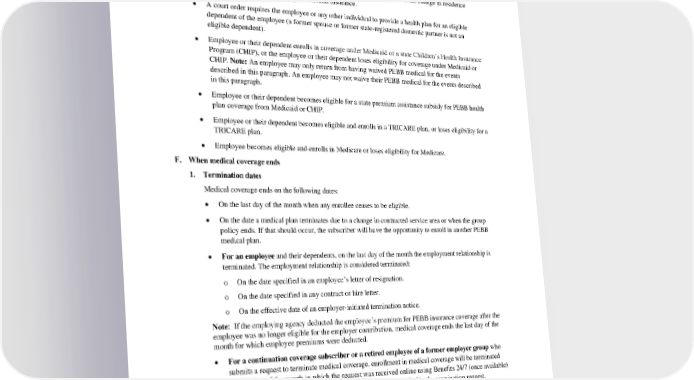 • Employee or their dependent has a change in enrollment under an employer-based group medical plan during its annual open enrollment that does not align with the PEBB Program’s annual open enrollment. • Employee’s dependent has a change in residence from outside of the United States to within the United States, or from within the United States to outside of the United States and the change in residence resulted in the dependent losing their health insurance. • A court order requires the employee or any other individual to provide a health plan for an eligible dependent of the employee (a former spouse or former state-registered domestic partner is not an eligible dependent). • Employee or their dependent enrolls in coverage under Medicaid or a state Children’s Health Insurance Program (CHIP), or the employee or their dependent loses eligibility for coverage under Medicaid or CHIP. Note: An employee may only return from having waived PEBB medical for the events described in this paragraph. An employee may not waive their PEBB medical for the events described in this paragraph. • Employee or their dependent becomes eligible for a state premium assistance subsidy for PEBB health plan coverage from Medicaid or CHIP. • Employee or their dependent becomes eligible and enrolls in a TRICARE plan, or loses eligibility for a TRICARE plan. • Employee becomes eligible and enrolls in Medicare or loses eligibility for Medicare. F. When medical coverage ends 1. Termination dates Medical coverage ends on the following dates: • On the last day of the month when any enrollee ceases to be eligible. • On the date a medical plan terminates due to a change in contracted service area or when the group policy ends. If that should occur, the subscriber will have the opportunity to enroll in another PEBB medical plan. • For an employee and their dependents, on the last day of the month the employment relationship is terminated. The employment relationship is considered terminated: o On the date specified in an employee’s letter of resignation. o On the date specified in any contract or hire letter. o On the effective date of an employer-initiated termination notice. Note: If the employing agency deducted the employee’s premium for PEBB insurance coverage after the employee was no longer eligible for the employer contribution, medical coverage ends the last day of the month for which employee premiums were deducted. • For a continuation coverage subscriber or a retired employee of a former employer group who submits a request to terminate medical coverage, enrollment in medical coverage will be terminated the last day of the month in which the request was received online using Benefits 24/7 (once available) or by the PEBB Program, or on the last day of the month specified in the termination request, whichever is later. If the request is received on the first day of the month, medical coverage will be terminated on the last day of the previous month. Exception: When a subscriber or their dependent is enrolled in a Medicare Advantage or Medicare Advantage Prescription Drug plan, the medical plan enrollment will terminate on the last day of the month when the PEBB Medicare Advantage Plan Disenrollment form (form D) is received. PEBB_CA_2024 58