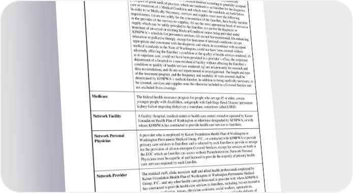Medical Condition A disease, illness or injury. Medically Necessary Pre-service, concurrent or post-service reviews may be conducted. Once a service has been reviewed, additional reviews may be conducted. Enrollees will be notified in writing when a determination has been made. Appropriate and clinically necessary services, as determined by KFHPWA’s medical director according to generally accepted principles of good medical practice, which are rendered to an Enrollee for the diagnosis, care or treatment of a Medical Condition and which meet the standards set forth below. In order to be Medically Necessary, services and supplies must meet the following requirements: (a) are not solely for the convenience of the Enrollee, their family member or the provider of the services or supplies; (b) are the most appropriate level of service or supply which can be safely provided to the Enrollee; (c) are for the diagnosis or treatment of an actual or existing Medical Condition unless being provided under KFHPWA’s schedule for preventive services; (d) are not for recreational, life-enhancing, relaxation or palliative therapy, except for treatment of terminal conditions; (e) are appropriate and consistent with the diagnosis and which, in accordance with accepted medical standards in the State of Washington, could not have been omitted without adversely affecting the Enrollee’s condition or the quality of health services rendered; (f) as to inpatient care, could not have been provided in a provider’s office, the outpatient department of a hospital or a non-residential facility without affecting the Enrollee’s condition or quality of health services rendered; (g) are not primarily for research and data accumulation; and (h) are not experimental or investigational. The length and type of the treatment program and the frequency and modality of visits covered shall be determined by KFHPWA’s medical director. In addition to being medically necessary, to be covered, services and supplies must be otherwise included as a Covered Service and not excluded from coverage. Medicare The federal health insurance program for people who are age 65 or older, certain younger people with disabilities, and people with End-Stage Renal Disease (permanent kidney failure requiring dialysis or a transplant, sometimes called ESRD). Network Facility A facility (hospital, medical center or health care center) owned or operated by Kaiser Foundation Health Plan of Washington or otherwise designated by KFHPWA, or with whom KFHPWA has contracted to provide health care services to Enrollees. Network Personal A provider who is employed by Kaiser Foundation Health Plan of Washington or Physician Washington Permanente Medical Group, P.C., or contracted with KFHPWA to provide primary care services to Enrollees and is selected by each Enrollee to provide or arrange for the provision of all non-emergent Covered Services, except for services set forth in the EOC which an Enrollee can access without Preauthorization. Network Personal Physicians must be capable of and licensed to provide the majority of primary health care services required by each Enrollee. Network Provider The medical staff, clinic associate staff and allied health professionals employed by Kaiser Foundation Health Plan of Washington or Washington Permanente Medical Group, P.C., and any other health care professional or provider with whom KFHPWA has contracted to provide health care services to Enrollees, including, but not limited to physicians, podiatrists, nurses, physician assistants, social workers, optometrists, psychologists, physical therapists and other professionals engaged in the delivery of healthcare services who are licensed or certified to practice in accordance with Title 18 Revised Code of Washington. Out-of-pocket Expenses Those Cost Shares paid by the Subscriber or Enrollee for Covered Services which are applied to the Out-of-pocket Limit. PEBB_CA_2024 72