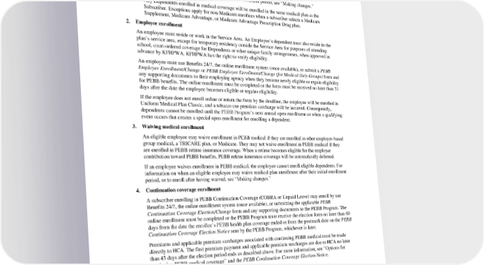 after the two-year period following the child’s 26th birthday. Verification will require renewed proof of disability and dependence from the subscriber. B. Enrollment for subscribers and dependents. 1. For all Subscribers and Dependents • To enroll at any time other than during the initial enrollment period, see “Making changes.” • Any Dependents enrolled in medical coverage will be enrolled in the same medical plan as the Subscriber. Exceptions apply for non-Medicare enrollees when a subscriber selects a Medicare Supplement, Medicare Advantage, or Medicare Advantage Prescription Drug plan. 2. Employee enrollment An employee must reside or work in the Service Area. An Employee’s dependent must also reside in the plan’s service area, except for temporary residency outside the Service Area for purposes of attending school, court-ordered coverage for Dependents or other unique family arrangements, when approved in advance by KFHPWA. KFHPWA has the right to verify eligibility. An employee must use Benefits 24/7, the online enrollment system (once available), or submit a PEBB Employee Enrollment/Change or PEBB Employee Enrollment/Change (for Medical Only Groups) form and any supporting documents to their employing agency when they become newly eligible or regain eligibility for PEBB benefits. The online enrollment must be completed or the form must be received no later than 31 days after the date the employee becomes eligible or regains eligibility. If the employee does not enroll online or return the form by the deadline, the employee will be enrolled in Uniform Medical Plan Classic, and a tobacco use premium surcharge will be incurred. Consequently, dependents cannot be enrolled until the PEBB Program’s next annual open enrollment or when a qualifying event occurs that creates a special open enrollment for enrolling a dependent. 3. Waiving medical enrollment An eligible employee may waive enrollment in PEBB medical if they are enrolled in other employer-based group medical, a TRICARE plan, or Medicare. They may not waive enrollment in PEBB medical if they are enrolled in PEBB retiree insurance coverage. When a retiree becomes eligible for the employer contribution toward PEBB benefits, PEBB retiree insurance coverage will be automatically deferred. If an employee waives enrollment in PEBB medical, the employee cannot enroll eligible dependents. For information on when an eligible employee may waive medical plan enrollment after their initial enrollment period, or to enroll after having waived, see “Making changes.” 4. Continuation coverage enrollment A subscriber enrolling in PEBB Continuation Coverage (COBRA or Unpaid Leave) may enroll by use Benefits 24/7, the online enrollment system (once available), or submitting the applicable PEBB Continuation Coverage Election/Change form and any supporting documents to the PEBB Program. The online enrollment must be completed or the PEBB Program must receive the election form no later than 60 days from the date the enrollee’s PEBB health plan coverage ended or from the postmark date on the PEBB Continuation Coverage Election Notice sent by the PEBB Program, whichever is later. Premiums and applicable premium surcharges associated with continuing PEBB medical must be made directly to HCA. The first premium payment and applicable premium surcharges are due to HCA no later than 45 days after the election period ends as described above. For more information, see “Options for continuing PEBB medical coverage” and the PEBB Continuation Coverage Election Notice. 5. Retired employee of a former employer group enrollment A retired employee or a retired school employee of a former employer group may enroll and self-pay premiums using Benefits 24/7, the online enrollment system (once available), or by submitting the PEBB Continuation Coverage (Employer Group Ended Participation) Election/Change form and any supporting documents to the PEBB Program. The online enrollment must be completed or the PEBB Program must receive the required form no later than 60 days after the employer group ended their participation. PEBB_CA_2024 49