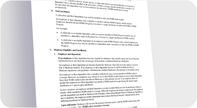 Changes to health plan coverage or enrollment as described in subsection (a) through (c) will begin the first day of the month following receipt of the NMSN. If the NMSN is received on the first day of the month, the change to health plan coverage or enrollment begins on that day. A dependent will be removed from the subscriber’s health plan coverage as described in (d) the last day of the month the NMSN is received. If that day is the first of the month, the change in enrollment will be made the last day of the previous month. When a NMSN requires a spouse, former spouse, or other individual to provide health plan coverage for a dependent who is already enrolled in the subscriber’s PEBB coverage, and that health plan coverage is in fact provided, the dependent may be removed from the subscriber’s PEBB health plan coverage prospectively. 8. Dual enrollment A subscriber and their dependents may each be enrolled in only one PEBB medical plan. An employee or their dependent who is eligible to enroll in both the PEBB Program and the School Employees Benefits Board (SEBB) Program is limited to a single enrollment in either the PEBB or SEBB Program. For example: • A child who is an eligible dependent under two parents enrolled in PEBB Program benefits may be enrolled as a dependent under both parents but is limited to a single enrollment in PEBB medical. • A child who is an eligible dependent of an employee in the PEBB Program and a school employee in the SEBB Program may only be enrolled as a dependent under one parent in either the PEBB or SEBB Program. C. Medicare Eligibility and Enrollment. 1. Employee and dependent If an employee or their dependent becomes eligible for Medicare, they should contact the Social Security Administration to ask about the advantages of immediate or deferred Medicare enrollment. An employee or their dependent are deemed eligible for Medicare when they have the option to receive Part A Medicare benefits. If an employee or their dependent chooses to enroll in Medicare Part A, Medicare regulations and guidelines will determine whether Medicare is the primary or secondary payer. An employee or their dependent who is enrolled in Medicare may remain enrolled in PEBB medical coverage. However, an employee may choose to waive their PEBB medical plan or remove their dependent from their PEBB medical plan and choose Medicare as their primary insurer. If an employee does so, neither the employee nor their dependent can enroll in PEBB medical except during the annual open enrollment or a special open enrollment. In most situations, an employee and their dependent can elect to defer Medicare Part B enrollment without a penalty while enrolled in PEBB medical coverage. When the employee terminates employment, the employee and the dependent can enroll in Medicare Part B during a Special Enrollment Period. If Medicare eligibility is due to disability, the employee or their dependent must contact the Social Security Administration about deferring enrollment in Medicare Part B. Upon retirement, Medicare will become the primary insurance payer, and the PEBB medical plan will become secondary. See “PEBB retiree insurance coverage.” 2. Continuation coverage subscriber, a retired employee of a former employer group, or their dependent If a continuation coverage subscriber, a retired employee of a former employer groui, or their dependent becomes eligible for Medicare, federal regulations allow enrollment in Medicare three months before they turn age 65. If they do not enroll within three months before the month they turn age 65, enrollment in PEBB_CA_2024 51