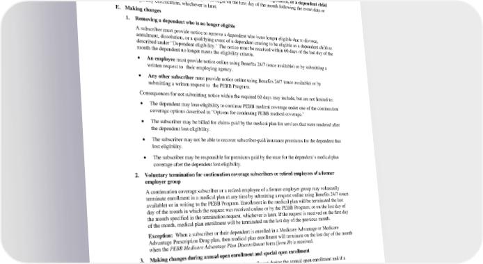 • For a newly adopted child, medical coverage will begin on the date of placement or the date a legal obligation is assumed in anticipation of adoption, whichever is earlier. • For a spouse or state registered domestic partner of a subscriber, medical coverage will begin the first day of the month in which the event occurs. If the special open enrollment is due to the enrollment of an extended dependent, or a dependent child with a disability, medical coverage will begin on the first day of the month following the event date or eligibility certification, whichever is later. E. Making changes 1. Removing a dependent who is no longer eligible A subscriber must provide notice to remove a dependent who is no longer eligible due to divorce, annulment, dissolution, or a qualifying event of a dependent ceasing to be eligible as a dependent child as described under “Dependent eligibility.” The notice must be received within 60 days of the last day of the month the dependent no longer meets the eligibility criteria. • An employee must provide notice online using Benefits 24/7 (once available) or by submitting a written request to their employing agency. • Any other subscriber must provide notice online using Benefits 24/7 (once available) or by submitting a written request to the PEBB Program. Consequences for not submitting notice within the required 60 days may include, but are not limited to: • The dependent may lose eligibility to continue PEBB medical coverage under one of the continuation coverage options described in “Options for continuing PEBB medical coverage.” • The subscriber may be billed for claims paid by the medical plan for services that were rendered after the dependent lost eligibility. • The subscriber may not be able to recover subscriber-paid insurance premiums for the dependent that lost eligibility. • The subscriber may be responsible for premiums paid by the state for the dependent’s medical plan coverage after the dependent lost eligibility. 2. Voluntary termination for continuation coverage subscribers or retired employees of a former employer group A continuation coverage subscriber or a retired employee of a former employer group may voluntarily terminate enrollment in a medical plan at any time by submitting a request online using Benefits 24/7 (once available) or in writing to the PEBB Program. Enrollment in the medical plan will be terminated the last day of the month in which the request was received online or by the PEBB Program, or on the last day of the month specified in the termination request, whichever is later. If the request is received on the first day of the month, medical plan enrollment will be terminated on the last day of the previous month. Exception: When a subscriber or their dependent is enrolled in a Medicare Advantage or Medicare Advantage Prescription Drug plan, then medical plan enrollment will terminate on the last day of the month when the PEBB Medicare Advantage Plan Disenrollment form (form D) is received. 3. Making changes during annual open enrollment and special open enrollment A subscriber may make certain changes to their enrollment during the annual open enrollment and if a specific life event creates a special open enrollment period. 4. Annual Open Enrollment changes. An employee may make the following changes to their enrollment during the PEBB Program’s annual open enrollment period: • Change their medical plan PEBB_CA_2024 53