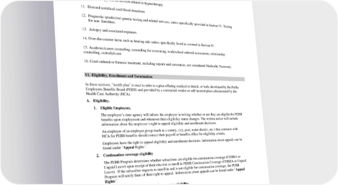 6) Regulations, records, applications and any other documents or actions issued by, filed with or taken by, the FDA or other agencies within the United States Department of Health and Human Services, or any state agency performing similar functions. Appeals regarding KFHPWA denial of coverage can be submitted to the Member Appeal Department, or to KFHPWA's medical director at P.O. Box 34593, Seattle, WA 98124-1593. 10. Hypnotherapy and all services related to hypnotherapy. 11. Directed umbilical cord blood donations. 12. Prognostic (predictive) genetic testing and related services, unless specifically provided in Section IV. Testing for non- Enrollees. 13. Autopsy and associated expenses. 14. Over-the-counter items such as hearing aids unless specifically listed as covered in Section IV. 15. Academic/career counseling, counseling for overeating, work/school ordered assessments, relationship counseling, custodial care 16. Court-ordered or forensic treatment, including reports and summaries, not considered Medically Necessary. VI. Eligibility, Enrollment and Termination In these sections, “health plan” is used to refer to a plan offering medical or dental, or both, developed by the Public Employees Benefits Board (PEBB) and provided by a contracted vendor or self-insured plans administered by the Health Care Authority (HCA). A. Eligibility. 1. Eligible Employees. The employee’s state agency will inform the employee in writing whether or not they are eligible for PEBB benefits upon employment and whenever their eligibility status changes. The written notice will include information about the employee’s right to appeal eligibility and enrollment decisions. An employee of an employer group (such as a county, city, port, water district, etc.) that contracts with HCA for PEBB benefits should contact their payroll or benefits office for eligibility criteria. Employees have the right to appeal eligibility and enrollment decisions. Information about appeals can be found under “Appeal Rights”. 2. Continuation coverage eligibility The PEBB Program determines whether subscribers are eligible for continuation coverage (COBRA or Unpaid Leave) upon receipt of their election to enroll in PEBB Continuation Coverage (COBRA or Unpaid Leave). If the subscriber requests to enroll in and is not eligible for continuation coverage, the PEBB Program will notify them of their right to appeal. Information about appeals can be found under “Appeal Rights”. 3. Retired employee of a former employer group eligibility The PEBB Program determines whether a retired employee or a retired school employee of a former employer group is eligible to self-pay coverage upon receipt of their election to enroll. If the retired employee or the retired school employee requests to enroll and is not eligible, the PEBB Program will notify them of their right to appeal. Information about appeals can be found under “Appeal rights.” PEBB_CA_2024 47
