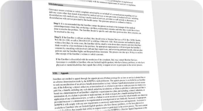 Any enrollee may appeal a decision regarding the administration of a PEBB medical plan by following the appeal provisions of the plan, except when regarding eligibility, enrollment, and premium payment decisions. Learn more at hca.wa.gov/pebb-appeals. I. Relationship to law and regulations Any provision of this certificate of coverage that is in conflict with any governing law or regulation of Washington State is hereby amended to comply with the minimum requirements of such law or regulation. VII. Grievances Grievance means a written or verbal complaint submitted by or on behalf of a covered person regarding service delivery issues other than denial of payment for medical services or non-provision of medical services, including dissatisfaction with medical care, waiting time for medical services, provider or staff attitude or demeanor, or dissatisfaction with service provided by the health carrier. The grievance process is outlined as follows: Step 1: It is recommended that the Enrollee contact the person involved or the manager of the medical center/department where they are having a problem, explain their concerns and what they would like to have done to resolve the problem. The Enrollee should be specific and make their position clear. Most concerns can be resolved in this way. Step 2: If the Enrollee is still not satisfied, they should write to Member Services at P.O. Box 34590, Seattle, WA 98124-1590, or call at 206-630-0107 or toll-free 1-866-648-1928. Most concerns are handled by phone within a few days. In some cases, the Enrollee will be asked to write down their concerns and state what they think would be a fair resolution to the problem. An appropriate representative will investigate the Enrollee’s concern by consulting with involved staff and their supervisors, and reviewing pertinent records, relevant plan policies and the Enrollee Rights and Responsibilities statement. This process can take up to 30 days to resolve after receipt of the Enrollee’s written or verbal statement. If the Enrollee is dissatisfied with the resolution of the complaint, they may contact Member Services. Assistance is available to Enrollees who are limited-English speakers, who have literacy problems, or who have physical or mental disabilities that impede their ability to request review or participate in the review process. VIII. Appeals Enrollees are entitled to appeal through the appeals process if/when coverage for an item or service is denied due to an adverse determination made by the KFHPWA medical director. The appeals process is available for an Enrollee to seek reconsideration of an adverse benefit determination (action). Adverse benefit determination (action) means any of the following: a denial, reduction, or termination of, or a failure to provide or make payment (in whole or in part) for, a benefit, including any such denial, reduction, termination, or failure to provide or make payment that is based on a determination of an Enrollee’s eligibility to participate in a plan, and including, a denial, reduction, or termination of, or a failure to provide or make payment, in whole or in part, for a benefit resulting from the application of any utilization review, as well as a failure to cover an item or service for which benefits are otherwise provided because it is determined to be experimental or investigational or not Medically Necessary or appropriate. KFHPWA will comply with any new requirements as necessary under federal laws and regulations. Assistance is available to Enrollees who are limited-English speakers, who have literacy problems, or who have physical or mental disabilities that impede their ability to request review or participate in the review process. The most current information about your appeals process is available by contacting KFHPWA’s Member Appeal Department at the address or telephone number below. 1. Initial Appeal If the Enrollee or the Enrollee’s legal representative wishes to appeal a KFHPWA decision to deny, modify, reduce or terminate coverage of or payment for health care services, they must submit a request for an appeal either orally or in writing to KFHPWA’s Member Appeal Department, specifying why they disagree with the decision. The appeal must be submitted within 180 days of receipt of the denial notice. KFHPWA will notify PEBB_CA_2024 62