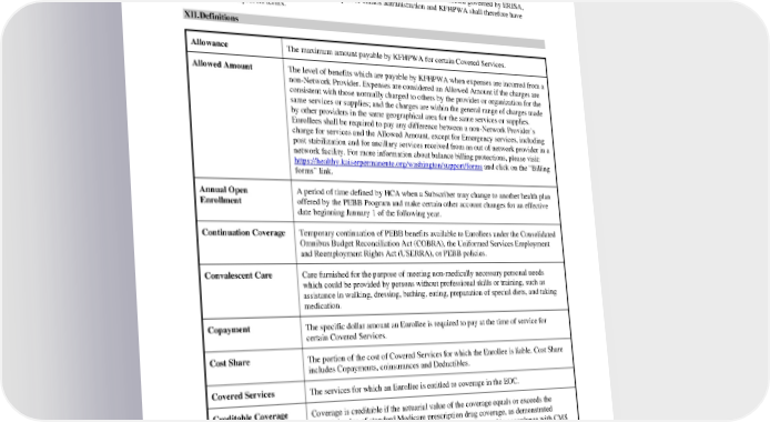 If reasonable collections costs have been incurred by an attorney for the Injured Person in connection with obtaining recovery, KFHPWA will reduce the amount of reimbursement to KFHPWA by the amount of an equitable apportionment of such collection costs between KFHPWA and the Injured Person. This reduction will be made only if each of the following conditions has been met: (i) KFHPWA receives a list of the fees and associated costs before settlement and (ii) the Injured Person’s attorney’s actions were directly related to securing recovery for the Injured Party to the extent the provisions of this Subrogation and Reimbursement section are deemed governed by ERISA, implementation of this section shall be deemed a part of claims administration and KFHPWA shall therefore have discretion to interpret its terms. XII. Definitions Allowance The maximum amount payable by KFHPWA for certain Covered Services. Allowed Amount The level of benefits which are payable by KFHPWA when expenses are incurred from a non-Network Provider. Expenses are considered an Allowed Amount if the charges are consistent with those normally charged to others by the provider or organization for the same services or supplies; and the charges are within the general range of charges made by other providers in the same geographical area for the same services or supplies. Enrollees shall be required to pay any difference between a non-Network Provider’s charge for services and the Allowed Amount, except for Emergency services, including post stabilization and for ancillary services received from an out of network provider in a network facility. For more information about balance billing protections, please visit: https://healthy.kaiserpermanente.org/washington/support/forms and click on the “Billing forms” link. Annual Open A period of time defined by HCA when a Subscriber may change to another health plan Enrollment offered by the PEBB Program and make certain other account changes for an effective date beginning January 1 of the following year. Continuation Coverage Temporary continuation of PEBB benefits available to Enrollees under the Consolidated Omnibus Budget Reconciliation Act (COBRA), the Uniformed Services Employment and Reemployment Rights Act (USERRA), or PEBB policies. Convalescent Care Care furnished for the purpose of meeting non-medically necessary personal needs which could be provided by persons without professional skills or training, such as assistance in walking, dressing, bathing, eating, preparation of special diets, and taking medication. Copayment The specific dollar amount an Enrollee is required to pay at the time of service for certain Covered Services. Cost Share The portion of the cost of Covered Services for which the Enrollee is liable. Cost Share includes Copayments, coinsurances and Deductibles. Covered Services The services for which an Enrollee is entitled to coverage in the EOC. Creditable Coverage Coverage is creditable if the actuarial value of the coverage equals or exceeds the actuarial value of standard Medicare prescription drug coverage, as demonstrated through the use of generally accepted actuarial principles and in accordance with CMS actuarial guidelines. In general, the actuarial determination measures whether the expected amount of paid claims under KFHPWA’s prescription drug coverage is at least as much as the expected amount of paid claims under the standard Medicare prescription drug benefit. PEBB_CA_2024 70