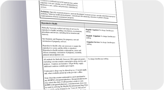 services. Pulmonary rehabilitation is covered when clinical criteria are Outpatient Services: After Deductible, Enrollee met. pays $30 specialty care provider services Copayment Preauthorization is required after initial visit. Limited to a combined total of 60 inpatient days and 60 outpatient visits per calendar year for all Rehabilitation, Habilitative care, cardiac and pulmonary rehabilitation services. Exclusions: Specialty treatment programs; inpatient Residential Treatment services; specialty rehabilitation programs including “behavior modification programs”; recreational, life-enhancing, relaxation or palliative therapy; implementation of home maintenance programs Reproductive Health Medically Necessary medical and surgical services for Hospital - Inpatient: No charge; Enrollee pays reproductive health, including consultations, examinations, nothing procedures and devices, including device insertion and removal. Hospital - Outpatient: No charge; Enrollee pays nothing See Maternity and Pregnancy for pregnancy care and termination of pregnancy services. Outpatient Services: No charge; Enrollee pays nothing Reproductive health is the care necessary to support the reproductive system and the ability to reproduce. Reproductive health includes contraception, cancer and disease screenings, termination of pregnancy, maternity, prenatal and postpartum care. All methods for Medically Necessary FDA-approved generic No charge; Enrollee pays nothing (including over-the-counter) contraceptive drugs, devices and products. Condoms are limited to 120 per 90-day supply, additional condoms available upon request. Contraceptive drugs may be allowed up to a 12-month supply and, when available, picked up in the provider’s office. Note: Over-the-counter contraceptives can be purchased at any KFHPWA-designated pharmacy. Designated pharmacies may submit the claim. If self-payment is made at a non- KFHWA-designated pharmacy, a reimbursement claim may be made by utilizing the Member Reimbursement Drug Claim Form which can be obtained in the “Forms & Publications” section on www.kp.org/wa or by calling Member Services. To request an exception for quantity limits on condoms, members may submit a request online at www.KP.org/wa/formulary or by contacting Member Services. PEBB_CA_2024 39
