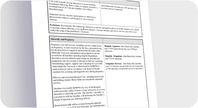 Exclusions: Supportive care rendered primarily to maintain the level of correction already achieved; care rendered primarily for the convenience of the Enrollee; care rendered on a non-acute, asymptomatic basis; charges for any other services that do not meet KFHPWA clinical criteria as Medically Necessary Massage Therapy Visits with licensed massage therapists to restore function After Deductible, Enrollee pays $30 specialty care immediately following illness, injury or surgery, limited to a provider services Copayment combined total of 24 visits per calendar year without Preauthorization. Outpatient services require a prescription or order from a physician that reflects a written plan of care to restore function. Exclusions: Recreational; life-enhancing, relaxation or services designed to relieve or soothe symptoms of a disease or disorder without effecting a cure (palliative therapy); massage therapists preventive services; any services not within the scope of the practitioner’s licensure Maternity and Pregnancy Pregnancy care and services, including care for complications Hospital - Inpatient: After Deductible, Enrollee of pregnancy, in utero treatment for the fetus, prenatal testing pays $150 Copayment per day up to $750 per for the detection of congenital and heritable disorders when admission Medically Necessary and prenatal and postpartum care are covered for all Enrollees including eligible Dependents. Hospital - Outpatient: After Deductible, Enrollee Preventive services related to preconception, prenatal and pays $150 Copayment postpartum care are covered as Preventive Services including breastfeeding support, supplies and counseling for each birth Outpatient Services: After Deductible, Enrollee when Medically Necessary as determined by KFHPWA’s pays $15 primary care provider services Copayment medical director and in accordance with Board of Health or $30 specialty care provider services Copayment standards for screening and diagnostic tests during pregnancy. Delivery and associated Hospital Care, including home births and birthing centers. Home births are considered outpatient services. Enrollees must notify KFHPWA by way of the Hospital notification line within 24 hours of any admission, or as soon thereafter as medically possible. The Enrollee’s provider, in consultation with the Enrollee, will determine the Enrollee’s length of inpatient stay following delivery. Donor human milk will be covered during the inpatient hospital stay when Medically Necessary, provided through a milk bank and ordered by a licensed Provider or board- certified lactation consultant. Termination of pregnancy. Hospital - Inpatient: Enrollee pays nothing Non-Emergency inpatient hospital services require Hospital - Outpatient: Enrollee pays nothing Preauthorization. PEBB_CA_2024 29