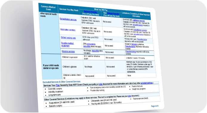 Common Medical What You Will Pay Limitations, Exceptions, & Other Important Event Services You May Need Network Provider Non-Network Provider Information (You will pay the least) (You will pay the most) other special health Outpatient: $30 / visit Combined with Habilitation services: needs Rehabilitation services Inpatient: $150 / day up to Not covered Outpatient: 60 visit limit / year. Inpatient: 60- $750 / admission day limit / year, preauthorization required or will not be covered. Outpatient: $30 / visit Combined with Rehabilitation services: Habilitation services Inpatient: $150 / day up to Not covered Outpatient: 60 visit limit / year. Inpatient: 60- $750 / admission day limit / year, preauthorization required or will not be covered. Skilled nursing care $150 / day up to $750 / Not covered 150-day limit / year. Preauthorization admission required or will not be covered. Durable medical 20% coinsurance, Subject to formulary guidelines. equipment deductible does not apply. Not covered Preauthorization required or will not be covered. Hospice services No charge, deductible does Not covered Preauthorization required or will not be not apply. covered. Children’s eye exam $15 / visit for refractive Not covered Limited to 1 exam / 12 months exam Members age 19 and over limited to $150 If your child needs every 24 months. Members under age 19 dental or eye care Children’s glasses No charge Not covered limited to 1 pair of frames and lenses / year or contact lenses covered at 50% coinsurance. Children’s dental check- Not covered Not covered None up Excluded Services & Other Covered Services: Services Your Plan Generally Does NOT Cover (Check your policy or plan document for more information and a list of any other excluded services.) • Cosmetic surgery • Non-emergency care when traveling outside the U.S. • Routine foot care • Infertility treatment • Private-duty nursing • Weight loss programs • Long-term care Other Covered Services (Limitations may apply to these services. This isn’t a complete list. Please see your plan document.) • Acupuncture (24 visit limit / year) • Chiropractic care (24 visit limit / year) • Routine eye care (Adult) • Bariatric surgery • Hearing aids ($3,000 limit / ear / 36 months) Page 4 of 6