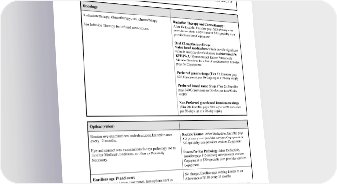 Exclusions: Confinement, treatment or service that results from an illness or injury arising out of or in the course of any employment for wage or profit including injuries, illnesses or conditions incurred as a result of self-employment; Services needed because of a workplace-related illness or injury that the Office of Workers’ Compensation Programs (OWCP) or a similar Federal or State agency determines they must provide; or OWCP or a similar agency pays through a third party injury settlement or other similar proceeding that is based on a claim you filed under OWCP or similar laws Oncology Radiation therapy, chemotherapy, oral chemotherapy. Radiation Therapy and Chemotherapy: After Deductible, Enrollee pays $15 primary care See Infusion Therapy for infused medications. provider services Copayment or $30 specialty care provider services Copayment Oral Chemotherapy Drugs: Value based medications which provide significant value in treating chronic disease as determined by KFHPWA (Please contact Kaiser Permanente Member Services for a list of medications): Enrollee pays $5 Copayment Preferred generic drugs (Tier 1): Enrollee pays $20 Copayment per 30-days up to a 90-day supply Preferred brand name drugs (Tier 2): Enrollee pays $40 Copayment per 30-days up to a 90-day supply Non-Preferred generic and brand name drugs (Tier 3): Enrollee pays 50% up to $250 maximum per 30-days up to a 90-day supply Optical (vision) Routine eye examinations and refractions, limited to once Routine Exams: After Deductible, Enrollee pays every 12 months. $15 primary care provider services Copayment or $30 specialty care provider services Copayment Eye and contact lens examinations for eye pathology and to monitor Medical Conditions, as often as Medically Exams for Eye Pathology: After Deductible, Necessary. Enrollee pays $15 primary care provider services Copayment or $30 specialty care provider services Copayment Enrollees age 19 and over: No charge; Enrollee pays nothing limited to an Eyeglass frames, lenses (any type), lens options such as Allowance of $150 every 24 months tinting, or prescription contact lenses, contact lens evaluations and examinations associated with their fitting. The benefit After Allowance, Enrollee pays 100% of all charges period begins on the date services are first obtained. The Allowance may be used toward the following in any Contact Lenses or Framed Lenses for Eye combination: Pathology: After Deductible, Enrollee pays nothing • Eyeglass frames • Eyeglass lenses (any type) including tinting and PEBB_CRCOB_2024 33