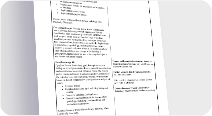 coating • Corrective industrial (safety) lenses • Sunglass lenses and frames when prescribed by an eye care provider for eye protection or light sensitivity • Corrective contact lenses in the absence of eye pathology, including associated fitting and evaluation examinations • Replacement frames, for any reason, including loss or breakage • Replacement contact lenses • Replacement eyeglass lenses Contact lenses or framed lenses for eye pathology when Medically Necessary. One contact lens per diseased eye in lieu of an intraocular lens is covered following cataract surgery provided the Enrollee has been continuously covered by KFHPWA since such surgery. In the event an Enrollee’s age or medical condition prevents the Enrollee from having an intraocular lens or contact lens, framed lenses are available. Replacement of lenses for eye pathology, including following cataract surgery, is covered only once within a 12-month period and only when needed due to a change in the Enrollee’s prescription. Replacement for loss or breakage is subject to the frames and lenses benefit. Enrollees to age 19: Frames and Lenses (in lieu of contact lenses): No Eyeglass frames, lenses (any type), lens options such as charge; Enrollee pays nothing for 1 set of frames and tinting, or prescription contact lenses, contact lens evaluations lenses per calendar year and examinations associated with their fitting. The benefit period begins on January 1 and continues through the end of Contact lenses (in lieu of eyeglasses): Enrollee the calendar year. The benefit may be used toward contact pays 50% coinsurance lenses (in lieu of eyeglasses) or 1 eyeglass frame and pair of lenses. After benefit is exhausted: Not covered; Enrollee • Eyeglass frames pays 100% of all charges • Eyeglass lenses (any type) including tinting and coating Contact Lenses or Framed Lenses for Eye • Corrective industrial (safety) lenses Pathology: After Deductible, Enrollee pays nothing • Corrective contact lenses in the absence of eye pathology, including associated fitting and evaluation examinations Contact lenses or framed lenses for eye pathology when Medically Necessary. One contact lens per diseased eye in lieu of an intraocular lens is covered following cataract surgery provided the Enrollee has been continuously covered by KFHPWA since such surgery. In the event an Enrollee’s age or medical condition prevents the Enrollee from having an intraocular lens or contact lens, framed lenses are available. Replacement of lenses for eye pathology, including following cataract PEBB_CRCOB_2024 34