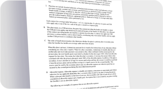 are considered parts of the same plan and there is no COB among those separate contracts. However, if COB rules do not apply to all contracts, or to all benefits in the same contract, the contract or benefit to which COB does not apply is treated as a separate plan. 1. Plan includes: group, individual or blanket disability insurance contracts and group or individual contracts issued by health care service contractors or health maintenance organizations (HMO), closed panel plans or other forms of group coverage; medical care components of long-term care contracts, such as skilled nursing care; and Medicare or any other federal governmental plan, as permitted by law. 2. Plan does not include: hospital indemnity or fixed payment coverage or other fixed indemnity or fixed payment coverage; accident only coverage; specified disease or specified accident coverage; limited benefit health coverage, as defined by state law; school accident type coverage; benefits for non- medical components of long-term care policies; automobile insurance policies required by statute to provide medical benefits; Medicare supplement policies; Medicaid coverage; or coverage under other federal governmental plans; unless permitted by law. Each contract for coverage under Subsection 1. or 2. is a separate plan. If a plan has two parts and COB rules apply only to one of the two, each of the parts is treated as a separate plan. B. This plan means, in a COB provision, the part of the contract providing the health care benefits to which the COB provision applies and which may be reduced because of the benefits of other plans. Any other part of the contract providing health care benefits is separate from this plan. A contract may apply one COB provision to certain benefits, such as dental benefits, coordinating only with similar benefits, and may apply another COB provision to coordinate other benefits. C. The order of benefit determination rules determine whether this plan is a primary plan or secondary plan when the Enrollee has health care coverage under more than one plan. When this plan is primary, it determines payment for its benefits first before those of any other plan without considering any other plan’s benefits. When this plan is secondary, it determines its benefits after those of another plan and must make payment in an amount so that, when combined with the amount paid by the primary plan, the total benefits paid or provided by all plans for the claim equal 100% of the total allowable expense for that claim. This means that when this plan is secondary, it must pay the amount which, when combined with what the primary plan paid, totals 100% of the allowable expense. In addition, if this plan is secondary, it must calculate its savings (its amount paid subtracted from the amount it would have paid had it been the primary plan) and record these savings as a benefit reserve for the covered Enrollee. This reserve must be used by the secondary plan to pay any allowable expenses not otherwise paid, that are incurred by the covered person during the claim determination period. D. Allowable Expense. Allowable expense is a health care expense, coinsurance or copayments and without reduction for any applicable deductible, that is covered at least in part by any plan covering the person. When a plan provides benefits in the form of services, the reasonable cash value of each service will be considered an allowable expense and a benefit paid. An expense that is not covered by any plan covering the Enrollee is not an allowable expense. The following are examples of expenses that are not allowable expenses: 1. The difference between the cost of a semi-private hospital room and a private hospital room is not an allowable expense, unless one of the plans provides coverage for private hospital room expenses. 2. If an Enrollee is covered by two or more plans that compute their benefit payments on the basis of usual and customary fees or relative value schedule reimbursement method or other similar reimbursement method, any amount in excess of the highest reimbursement amount for a specific benefit is not an allowable expense. PEBB_CRCOB_2024 63