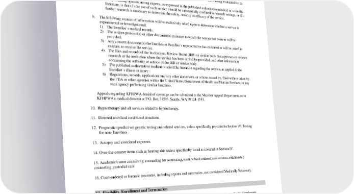 4) The service is provided pursuant to a written protocol or other document that lists an evaluation of the service’s safety, toxicity or efficacy as among its objectives. 5) The service is under continued scientific testing and research concerning the safety, toxicity or efficacy of services. 6) The service is provided pursuant to informed consent documents that describe the service as experimental or investigational, or in other terms that indicate that the service is being evaluated for its safety, toxicity or efficacy. 7) The prevailing opinion among experts, as expressed in the published authoritative medical or scientific literature, is that (1) the use of such service should be substantially confined to research settings, or (2) further research is necessary to determine the safety, toxicity or efficacy of the service. b. The following sources of information will be exclusively relied upon to determine whether a service is experimental or investigational: 1) The Enrollee’s medical records. 2) The written protocol(s) or other document(s) pursuant to which the service has been or will be provided. 3) Any consent document(s) the Enrollee or Enrollee’s representative has executed or will be asked to execute, to receive the service. 4) The files and records of the Institutional Review Board (IRB) or similar body that approves or reviews research at the institution where the service has been or will be provided, and other information concerning the authority or actions of the IRB or similar body. 5) The published authoritative medical or scientific literature regarding the service, as applied to the Enrollee’s illness or injury. 6) Regulations, records, applications and any other documents or actions issued by, filed with or taken by, the FDA or other agencies within the United States Department of Health and Human Services, or any state agency performing similar functions. Appeals regarding KFHPWA denial of coverage can be submitted to the Member Appeal Department, or to KFHPWA's medical director at P.O. Box 34593, Seattle, WA 98124-1593. 10. Hypnotherapy and all services related to hypnotherapy. 11. Directed umbilical cord blood donations. 12. Prognostic (predictive) genetic testing and related services, unless specifically provided in Section IV. Testing for non- Enrollees. 13. Autopsy and associated expenses. 14. Over-the-counter items such as hearing aids unless specifically listed as covered in Section IV. 15. Academic/career counseling, counseling for overeating, work/school ordered assessments, relationship counseling, custodial care 16. Court-ordered or forensic treatment, including reports and summaries, not considered Medically Necessary. VI. Eligibility, Enrollment and Termination In these sections, the term “retiree” or “retiring employee” includes a retiring employee from a Public Employees Benefits Board (PEBB) employing agency or employer group, and an elected or full-time appointed official of the legislative and executive branch of state government eligible to continue enrollment in PEBB retiree insurance coverage. The term “retiree” or “retiring school employee” includes a retiring school employee from a School Employees Benefits Board (SEBB) organization or employer group. Additionally, “health plan” is used to refer to a plan offering medical or dental, or both, developed by PEBB and provided by a contracted vendor or self-insured plans administered by the Health Care Authority (HCA). PEBB_CRCOB_2024 46