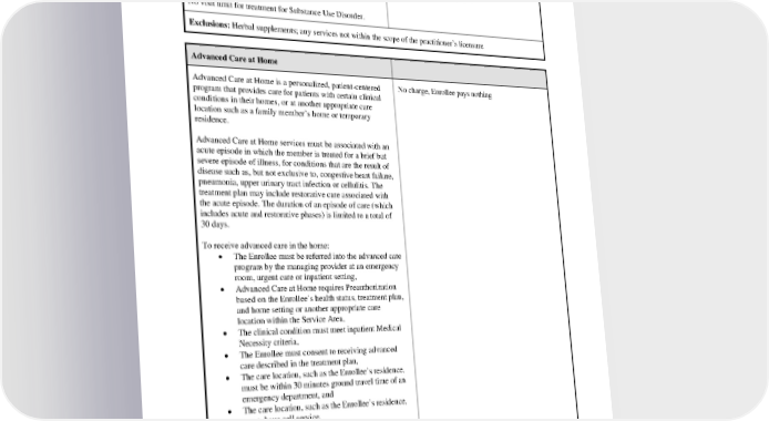Acupuncture Acupuncture needle treatment, limited to 24 visits per After Deductible, Enrollee pays $15 primary care calendar year without Preauthorization. Additional visits are provider services Copayment covered with Preauthorization. No visit limit for treatment for Substance Use Disorder. Exclusions: Herbal supplements; any services not within the scope of the practitioner’s licensure Advanced Care at Home Advanced Care at Home is a personalized, patient-centered No charge, Enrollee pays nothing program that provides care for patients with certain clinical conditions in their homes, or at another appropriate care location such as a family member’s home or temporary residence. Advanced Care at Home services must be associated with an acute episode in which the member is treated for a brief but severe episode of illness, for conditions that are the result of disease such as, but not exclusive to, congestive heart failure, pneumonia, upper urinary tract infection or cellulitis. The treatment plan may include restorative care associated with the acute episode. The duration of an episode of care (which includes acute and restorative phases) is limited to a total of 30 days. To receive advanced care in the home: • The Enrollee must be referred into the advanced care program by the managing provider at an emergency room, urgent care or inpatient setting, • Advanced Care at Home requires Preauthorization based on the Enrollee’s health status, treatment plan, and home setting or another appropriate care location within the Service Area, • The clinical condition must meet inpatient Medical Necessity criteria, • The Enrollee must consent to receiving advanced care described in the treatment plan, • The care location, such as the Enrollee’s residence, must be within 30 minutes ground travel time of an emergency department, and • The care location, such as the Enrollee’s residence, must, have cell service. Advanced Care at Home is provided through Medically Home, our Network provider, and they will provide the following services in the Enrollee’s home or appropriate care location: • Home visits by RNs, physical therapists, occupational therapists, speech therapists, respiratory PEBB_CRCOB_2024 13