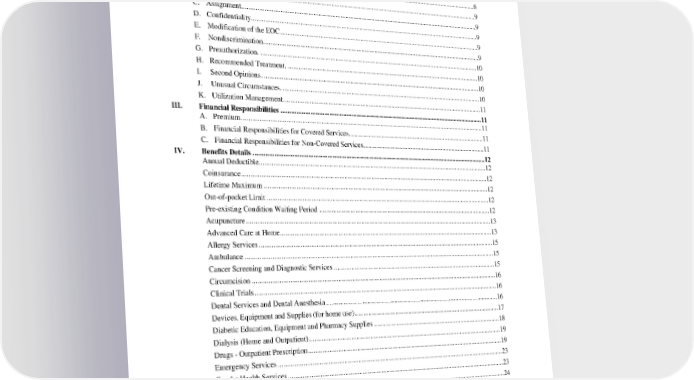 Table of Contents Table of Contents ......................................................................................................................................................... 3 I. Introduction ................................................................................................................................................... 6 II. How Covered Services Work ........................................................................................................................ 6 A. Accessing Care. ........................................................................................................................................ 6 B. Administration of the EOC. ..................................................................................................................... 9 C. Assignment. .............................................................................................................................................. 9 D. Confidentiality.......................................................................................................................................... 9 E. Modification of the EOC. ......................................................................................................................... 9 F. Nondiscrimination. ................................................................................................................................... 9 G. Preauthorization. .................................................................................................................................... 10 H. Recommended Treatment. ..................................................................................................................... 10 I. Second Opinions. ................................................................................................................................... 10 J. Unusual Circumstances. ......................................................................................................................... 10 K. Utilization Management. ........................................................................................................................ 11 III. Financial Responsibilities ........................................................................................................................... 11 A. Premium. ................................................................................................................................................ 11 B. Financial Responsibilities for Covered Services. ................................................................................... 11 C. Financial Responsibilities for Non-Covered Services. ........................................................................... 11 IV. Benefits Details ............................................................................................................................................ 12 Annual Deductible ......................................................................................................................................... 12 Coinsurance ................................................................................................................................................... 12 Lifetime Maximum ....................................................................................................................................... 12 Out-of-pocket Limit ...................................................................................................................................... 12 Pre-existing Condition Waiting Period ......................................................................................................... 12 Acupuncture .................................................................................................................................................. 13 Advanced Care at Home ................................................................................................................................ 13 Allergy Services ............................................................................................................................................ 15 Ambulance .................................................................................................................................................... 15 Cancer Screening and Diagnostic Services ................................................................................................... 15 Circumcision ................................................................................................................................................. 16 Clinical Trials ................................................................................................................................................ 16 Dental Services and Dental Anesthesia ......................................................................................................... 16 Devices, Equipment and Supplies (for home use) ......................................................................................... 17 Diabetic Education, Equipment and Pharmacy Supplies .............................................................................. 18 Dialysis (Home and Outpatient) .................................................................................................................... 19 Drugs - Outpatient Prescription ..................................................................................................................... 19 Emergency Services ...................................................................................................................................... 23 Gender Health Services ................................................................................................................................. 23 Hearing Examinations and Hearing Aids ...................................................................