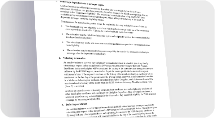 • For a spouse or state registered domestic partner of a subscriber, medical coverage will begin the first day of the month in which the event occurs. If the special open enrollment is due to the enrollment of an extended dependent or a dependent child with a disability, medical coverage will begin the first day of the month following the later of the event date or eligibility certification, whichever is later. E. Making changes 1. Removing a dependent who is no longer eligible A subscriber must provide notice to remove a dependent who is no longer eligible due to divorce, annulment, dissolution, or a qualifying event of a dependent ceasing to be eligible as a dependent child, as described under “Dependent eligibility.” The notice must be received online using Benefits 24/7 (once available) or by written request to the PEBB Program within 60 days of the last day of the month the dependent no longer meets the eligibility criteria. Consequences for not submitting notice within the required 60 days may include, but are not limited to: • The dependent may lose eligibility to continue PEBB medical coverage under one of the continuation coverage options described in “Options for continuing PEBB medical coverage.” • The subscriber may be billed for claims paid by the medical plan for services that were rendered after the dependent lost eligibility. • The subscriber may not be able to recover subscriber-paid insurance premiums for the dependent that lost eligibility. • The subscriber may be responsible for premiums paid by the state for the dependent’s medical plan coverage after the dependent lost eligibility. 2. Voluntary termination An enrolled retiree or survivor may voluntarily terminate enrollment in a medical plan at any time by submitting a request online using Benefits 24/7 (once available) or in writing to the PEBB Program. Enrollment in the medical plan will be terminated the last day of the month in which the request is received online or by the PEBB Program, or on the last day of the month specified in the termination request, whichever is later. If the request is received on the first day of the month, medical plan enrollment will be terminated on the last day of the previous month. When a retiree, a survivor, or their dependent is enrolled in a Medicare Advantage or Medicare Advantage Prescription Drug plan, medical plan enrollment will be terminated on the last day of the month when the PEBB Medicare Advantage Plan Disenrollment Form (form D) is received. A retiree or a survivor who voluntarily terminates their enrollment in a medical plan also terminates all other health plan enrollment and enrollment for all eligible dependents. Once coverage is terminated, a retiree or a survivor may not enroll again in the future unless they reestablish eligibility for PEBB insurance coverage by becoming newly eligible. 3. Deferring enrollment An enrolled retiree or survivor may defer enrollment in PEBB retiree insurance coverage at any time by submitting the request online using Benefits 24/7 (once available) or the PEBB Retiree Change Form (form E) along with any other required forms and supporting documents to the PEBB Program. Enrollment in PEBB retiree insurance coverage will be deferred effective the first of the month following the date the request is received online or by the PEBB Program. If the request is received on the first day of the month, enrollment will be deferred effective that day. When a retiree, a survivor, or their dependent is enrolled in a Medicare Advantage or Medicare Advantage Prescription Drug plan, medical plan enrollment will be deferred the first of the month following the date the Medicare Advantage Plan Disenrollment Form (form D) is received. A retiree or a survivor who deferred their enrollment may enroll as described in “Enrollment following deferral.” PEBB_CRCOB_2024 52