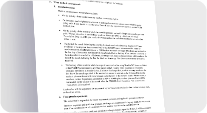 • Subscriber or their dependent enrolls in coverage under Medicaid or a state Children’s Health Insurance Program (CHIP) or the subscriber or their dependent loses eligibility for coverage under Medicaid or CHIP. • Subscriber or their dependent becomes eligible for a state premium assistance subsidy for PEBB health plan coverage from Medicaid or CHIP. • Subscriber’s dependent enrolls in Medicare or loses eligibility for Medicare. F. When medical coverage ends 1. Termination dates Medical coverage ends on the following dates: • On the last day of the month when any enrollee ceases to be eligible. • On the date a medical plan terminates due to a change in contracted service area or when the group policy ends. If that should occur, the subscriber will have the opportunity to enroll in another PEBB medical plan. • On the last day of the month in which the monthly premium and applicable premium surcharges were paid. When a subscriber is enrolled in a Medicare Advantage (MA) or a Medicare Advantage Prescription Drug (MAPD) plan, medical coverage ends at the end of the month after a termination notice is sent. • The first of the month following the date the election is received online using Benefits 24/7 (once available) or the required forms are received by the PEBB Program when an enrolled retiree or survivor requests to defer enrollment in PEBB retiree insurance coverage. If the forms are received on the first day of the month, enrollment will be deferred effective that day. When a retiree, a survivor, or their dependent is enrolled in a Medicare Advantage plan, medical plan enrollment will be deferred the first of the month following the date the Medicare Advantage Plan Disenrollment Form (form D) is received. • The last day of the month in which the request is received online using Benefits 24/7 (once available) or the PEBB Program receives a written request and all required forms requesting to voluntarily terminate enrollment in a medical plan. If a future date is specified, medical coverage terminates the last day of the month specified. If the termination request is received on the first day of the month, medical plan enrollment will be terminated on the last day of the previous month. When a retiree, a survivor, or their dependent is enrolled in an MA or MAPD plan, medical plan enrollment will be terminated on the last day of the month when the PEBB Medicare Advantage Plan Disenrollment Form (form D) is received. A subscriber will be responsible for payment of any services received after the date medical coverage ends, as described above. 2. Final premium payments The subscriber is responsible for timely payment of premiums and applicable premium surcharges. Premium payments and applicable premium surcharges are not prorated during any month, for any reason, even if an enrollee dies or asks to terminate their medical plan before the end of the month. If the monthly premium or applicable premium surcharges remain unpaid for 30 days, it will be considered delinquent. A subscriber is allowed a grace period of 30 days from the date the monthly premium or applicable premium surcharges become delinquent to pay the unpaid premium balance or applicable premium surcharges. If the subscriber’s premium balance or applicable premium surcharges remain unpaid for 60 days from the original due date, coverage will be terminated retroactive to the last day of the month for which the monthly premium and any applicable premium surcharges were paid. PEBB_CRCOB_2024 57