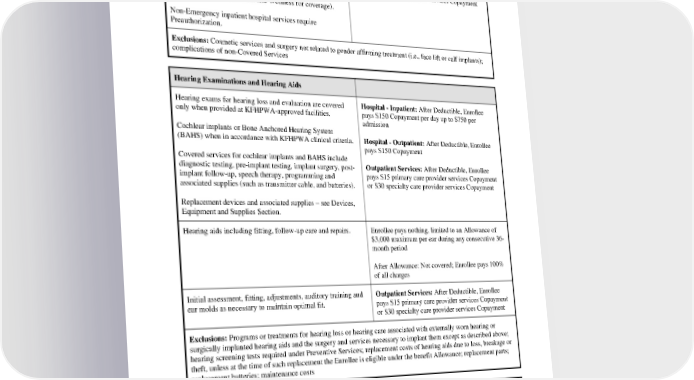 ria/pdf/gender_reassignment_surgery.pdf for details. pays $150 Copayment Prescription drugs are covered the same as for any other Outpatient Services: After Deductible, Enrollee condition (see Drugs – Outpatient Prescription for coverage). pays $15 primary care provider services Copayment or $30 specialty care provider services Copayment Counseling services are covered the same as for any other condition (see Mental Health and Wellness for coverage). Non-Emergency inpatient hospital services require Preauthorization. Exclusions: Cosmetic services and surgery not related to gender affirming treatment (i.e., face lift or calf implants); complications of non-Covered Services Hearing Examinations and Hearing Aids Hearing exams for hearing loss and evaluation are covered Hospital - Inpatient: After Deductible, Enrollee only when provided at KFHPWA-approved facilities. pays $150 Copayment per day up to $750 per admission Cochlear implants or Bone Anchored Hearing System (BAHS) when in accordance with KFHPWA clinical criteria. Hospital - Outpatient: After Deductible, Enrollee pays $150 Copayment Covered services for cochlear implants and BAHS include diagnostic testing, pre-implant testing, implant surgery, post- Outpatient Services: After Deductible, Enrollee implant follow-up, speech therapy, programming and pays $15 primary care provider services Copayment associated supplies (such as transmitter cable, and batteries). or $30 specialty care provider services Copayment Replacement devices and associated supplies – see Devices, Equipment and Supplies Section. Hearing aids including fitting, follow-up care and repairs. Enrollee pays nothing, limited to an Allowance of $3,000 maximum per ear during any consecutive 36- month period After Allowance: Not covered; Enrollee pays 100% of all charges Initial assessment, fitting, adjustments, auditory training and Outpatient Services: After Deductible, Enrollee ear molds as necessary to maintain optimal fit. pays $15 primary care provider services Copayment or $30 specialty care provider services Copayment Exclusions: Programs or treatments for hearing loss or hearing care associated with externally worn hearing or surgically implanted hearing aids and the surgery and services necessary to implant them except as described above; hearing screening tests required under Preventive Services; replacement costs of hearing aids due to loss, breakage or theft, unless at the time of such replacement the Enrollee is eligible under the benefit Allowance; replacement parts; replacement batteries; maintenance costs Home Health Care Home health care when the following criteria are met: No charge; Enrollee pays nothing • Except for patients receiving palliative care services, the Enrollee must be unable to leave home due to a health PEBB_CRCOB_2024 24