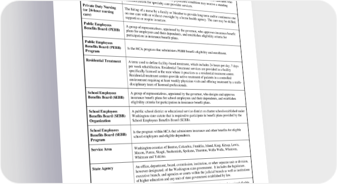 Plan Coinsurance The percentage amount the Enrollee is required to pay for Covered Services received. Preauthorization An approval by KFHPWA that entitles an Enrollee to receive Covered Services from a specified health care provider. Services shall not exceed the limits of the Preauthorization and are subject to all terms and conditions of the EOC. Enrollees who have a complex or serious medical or psychiatric condition may receive a standing Preauthorization for specialty care provider services. Private Duty Nursing The hiring of a nurse by a family or Member to provide long term and/or continuous one (or 24-hour nursing on one care with or without oversight by a home health agency. The care may be skilled, care) supportive or respite in nature. Public Employees A group of representatives, appointed by the governor, who approves insurance benefit Benefits Board (PEBB) plans for employees and their dependents, and establishes eligibility criteria for participation in insurance benefit plans. Public Employees Benefits Board (PEBB) Is the HCA program that administers PEBB benefit eligibility and enrollment. Program Residential Treatment A term used to define facility-based treatment, which includes 24 hours per day, 7 days per week rehabilitation. Residential Treatment services are provided in a facility specifically licensed in the state where it practices as a residential treatment center. Residential treatment centers provide active treatment of patients in a controlled environment requiring at least weekly physician visits and offering treatment by a multi- disciplinary team of licensed professionals. School Employees A group of representatives, appointed by the governor, who designs and approves Benefits Board (SEBB) insurance benefit plans for school employees and their dependents, and establishes eligibility criteria for participation in insurance benefit plans. School Employees A public school district or educational service district or charter school established under Benefits Board (SEBB) Washington state statute that is required to participate in benefit plans provided by the Organization School Employees Benefits Board (SEBB). School Employees Is the program within HCA that administers insurance and other benefits for eligible Benefits Board (SEBB) school employees and eligible dependents. Program Service Area Washington counties of Benton, Columbia, Franklin, Island, King, Kitsap, Lewis, Mason, Pierce, Skagit, Snohomish, Spokane, Thurston, Walla Walla, Whatcom, Whitman and Yakima. State Agency An office, department, board, commission, institution, or other separate unit or division, however designated, of the Washington state government. It includes the legislature, executive branch, and agencies or courts within the judicial branch as well as institutions of higher education and any unit of state government established by law. Subscriber A retiree, continuation coverage enrollee, or survivor who has been determined eligible and is enrolled in this plan, and is the individual to whom the PEBB Program or Kaiser will issue notices, requests, and premium bills on behalf of an Enrollee. Urgent Condition The sudden, unexpected onset of a Medical Condition that is of sufficient severity to PEBB_CRCOB_2024 71
