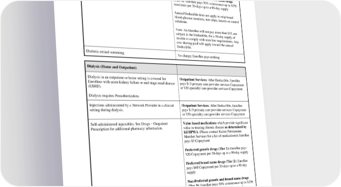 Preferred brand name drugs (Tier 2): Enrollee pays $40 Copayment per 30-days up to a 90-day supply Non-Preferred generic and brand name drugs (Tier 3): Enrollee pays 50% coinsurance up to $250 maximum per 30-days up to a 90-day supply Annual Deductible does not apply to strip-based blood glucose monitors, test strips, lancets or control solutions. Note: An Enrollee will not pay more than $35, not subject to the Deductible, for a 30-day supply of insulin to comply with state law requirements. Any cost sharing paid will apply toward the annual Deductible. Diabetic retinal screening. No charge; Enrollee pays nothing Dialysis (Home and Outpatient) Dialysis in an outpatient or home setting is covered for Outpatient Services: After Deductible, Enrollee Enrollees with acute kidney failure or end-stage renal disease pays $15 primary care provider services Copayment (ESRD). or $30 specialty care provider services Copayment Dialysis requires Preauthorization. Injections administered by a Network Provider in a clinical Outpatient Services: After Deductible, Enrollee setting during dialysis. pays $15 primary care provider services Copayment or $30 specialty care provider services Copayment Self-administered injectables. See Drugs – Outpatient Value based medications which provide significant Prescription for additional pharmacy information. value in treating chronic disease as determined by KFHPWA (Please contact Kaiser Permanente Member Services for a list of medications): Enrollee pays $5 Copayment Preferred generic drugs (Tier 1): Enrollee pays $20 Copayment per 30-days up to a 90-day supply Preferred brand name drugs (Tier 2): Enrollee pays $40 Copayment per 30-days up to a 90-day supply Non-Preferred generic and brand name drugs (Tier 3): Enrollee pays 50% coinsurance up to $250 maximum per 30-days up to a 90-day supply Drugs - Outpatient Prescription Prescription drugs, supplies and devices for a supply of 30 Value based medications which provide significant PEBB_CRCOB_2024 19