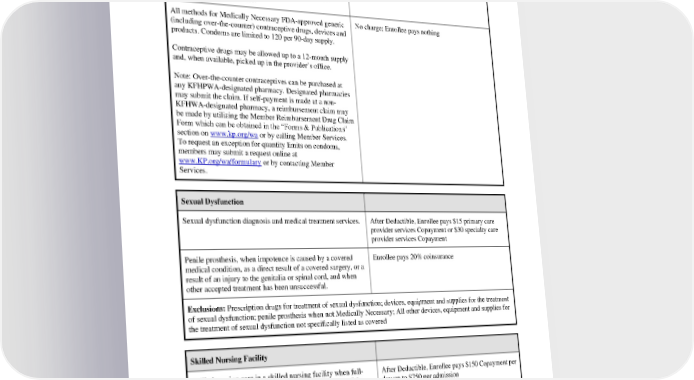 services Outpatient Services: No charge; enrollee pays nothing Reproductive health is the care necessary to support the reproductive system and the ability to reproduce. Reproductive health includes contraception, cancer and disease screenings, termination of pregnancy, maternity, prenatal and postpartum care. All methods for Medically Necessary FDA-approved generic No charge; Enrollee pays nothing (including over-the-counter) contraceptive drugs, devices and products. Condoms are limited to 120 per 90-day supply. Contraceptive drugs may be allowed up to a 12-month supply and, when available, picked up in the provider’s office. Note: Over-the-counter contraceptives can be purchased at any KFHPWA-designated pharmacy. Designated pharmacies may submit the claim. If self-payment is made at a non- KFHWA-designated pharmacy, a reimbursement claim may be made by utilizing the Member Reimbursement Drug Claim Form which can be obtained in the “Forms & Publications” section on www.kp.org/wa or by calling Member Services. To request an exception for quantity limits on condoms, members may submit a request online at www.KP.org/wa/formulary or by contacting Member Services. Sexual Dysfunction Sexual dysfunction diagnosis and medical treatment services. After Deductible, Enrollee pays $15 primary care provider services Copayment or $30 specialty care provider services Copayment Penile prosthesis, when impotence is caused by a covered Enrollee pays 20% coinsurance medical condition, as a direct result of a covered surgery, or a result of an injury to the genitalia or spinal cord, and when other accepted treatment has been unsuccessful. Exclusions: Prescription drugs for treatment of sexual dysfunction; devices, equipment and supplies for the treatment of sexual dysfunction; penile prosthesis when not Medically Necessary; All other devices, equipment and supplies for the treatment of sexual dysfunction not specifically listed as covered Skilled Nursing Facility Skilled nursing care in a skilled nursing facility when full- After Deductible, Enrollee pays $150 Copayment per time skilled nursing care is necessary in the opinion of the day up to $750 per admission attending physician, limited to a total of 150 days per calendar year. Care may include room and board; general nursing care; drugs, biologicals, supplies and equipment ordinarily provided or arranged by a skilled nursing facility; and short- PEBB_CRCOB_2024 39