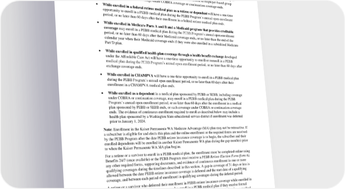 4. Enrollment following deferral A retiree or a survivor who defers enrollment in PEBB retiree insurance coverage: • While enrolled in employer-based group medical or such coverage under COBRA coverage or continuation coverage may enroll in a PEBB medical plan during the PEBB Program’s annual open enrollment period, or no later than 60 days after the date their enrollment in employer-based group medical coverage or such coverage under COBRA coverage or continuation coverage ends. • While enrolled in a federal retiree medical plan as a retiree or dependent will have a one-time opportunity to enroll in a PEBB medical plan during the PEBB Program’s annual open enrollment period, or no later than 60 days after their enrollment in a federal retiree medical plan ends. • While enrolled in Medicare Parts A and B and a Medicaid program that provides creditable coverage may enroll in a PEBB medical plan during the PEBB Program’s annual open enrollment period, or no later than 60 days after their Medicaid coverage ends, or no later than the end of the calendar year when their Medicaid coverage ends if they were also enrolled in a subsidized Medicare Part D plan. • While enrolled in qualified health plan coverage through a health benefit exchange developed under the Affordable Care Act will have a one-time opportunity to enroll or reenroll in a PEBB medical plan during the PEBB Program’s annual open enrollment period, or no later than 60 days after exchange coverage ends. • While enrolled in CHAMPVA will have a one-time opportunity to enroll in a PEBB medical plan during the PEBB Program’s annual open enrollment period, or no later than 60 days after their enrollment in a CHAMPVA medical plan ends. • While enrolled as a dependent in a medical plan sponsored by PEBB or SEBB, including coverage under COBRA or continuation coverage, may enroll in a PEBB medical plan during the PEBB Program’s annual open enrollment period, or no later than 60 days after the enrollment in a medical plan sponsored by PEBB or SEBB ends, or such coverage under COBRA or continuation coverage ends. The evidence of continuous enrollment required to enroll as described below may include a health plan sponsored by a Washington State educational service district if enrollment was deferred prior to January 1, 2024. Note: Enrollment in the Kaiser Permanente WA Medicare Advantage (MA) plan may not be retroactive. If a subscriber is eligible for and elects this plan and the online enrollment or the required forms are received by the PEBB Program after the date PEBB retiree insurance coverage is to begin, the subscriber and their enrolled dependents will be enrolled in another Kaiser Permanente WA plan during the gap month(s) prior to when the Kaiser Permanente WA MA plan begins. For a retiree or a survivor to enroll in a PEBB medical plan, the enrollment must be completed online using Benefits 24/7 (once available) or the PEBB Program must receive a PEBB Retiree Election Form (form A), any other required forms, supporting documents, and evidence of continuous enrollment in one or more qualifying coverages during the timelines described in this section. A gap in coverage of 31 days or less is allowed between the date PEBB retiree insurance coverage is deferred and the start date of a qualifying coverage, and between each period of enrollment in qualifying coverages during the deferral period. A retiree or a survivor who deferred their enrollment in PEBB retiree insurance coverage while enrolled in qualifying coverage as described above may also enroll in a PEBB medical plan if they receive formal notice that HCA has determined it is more cost-effective to enroll in a PEBB medical plan than a medical assistance program. A retiree or a survivor should contact the PEBB Program or visit hca.wa.gov/pebb-retirees to get the required forms, information on premiums, and a list of available medical plans. PEBB_CRCOB_2024 53