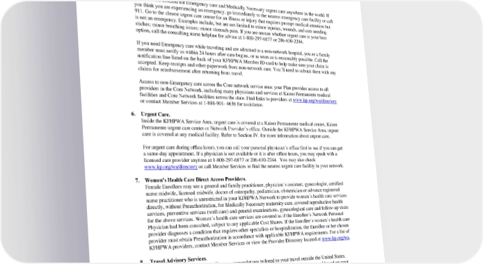 5. Emergency Services. Emergency services at a Network Facility or non-Network Facility are covered. Enrollees must notify KFHPWA by way of the Hospital notification line (1-888-457-9516 as noted on your member identification card) within 24 hours of any admission, or as soon thereafter as medically possible. Coverage for Emergency services at a non-Network Facility is limited to the Allowed Amount. Refer to Section IV. for more information about Emergency services. Enrollees are covered for Emergency care and Medically Necessary urgent care anywhere in the world. If you think you are experiencing an emergency, go immediately to the nearest emergency care facility or call 911. Go to the closest urgent care center for an illness or injury that requires prompt medical attention but is not an emergency. Examples include, but are not limited to minor injuries, wounds, and cuts needing stiches; minor breathing issues; minor stomach pain. If you are unsure whether urgent care is your best option, call the consulting nurse helpline for advice at 1-800-297-6877 or 206-630-2244. If you need Emergency care while traveling and are admitted to a non-network hospital, you or a family member must notify us within 24 hours after care begins, or as soon as is reasonably possible. Call the notification line listed on the back of your KFHPWA Member ID card to help make sure your claim is accepted. Keep receipts and other paperwork from non-network care. You’ll need to submit them with any claims for reimbursement after returning from travel. Access to non-Emergency care across the Core network service area: your Plan provides access to all providers in the Core Network, including many physicians and services at Kaiser Permanente medical facilities and Core Network facilities across the state. Find links to providers at www.kp.org/wa/directory or contact Member Services at 1-888-901- 4636 for assistance. 6. Urgent Care. Inside the KFHPWA Service Area, urgent care is covered at a Kaiser Permanente medical center, Kaiser Permanente urgent care center or Network Provider’s office. Outside the KFHPWA Service Area, urgent care is covered at any medical facility. Refer to Section IV. for more information about urgent care. For urgent care during office hours, you can call your personal physician’s office first to see if you can get a same-day appointment. If a physician is not available or it is after office hours, you may speak with a licensed care provider anytime at 1-800-297-6877 or 206-630-2244. You may also check www.kp.org/wa/directory or call Member Services to find the nearest urgent care facility in your network. 7. Women’s Health Care Direct Access Providers. Female Enrollees may see a general and family practitioner, physician’s assistant, gynecologist, certified nurse midwife, licensed midwife, doctor of osteopathy, pediatrician, obstetrician or advance registered nurse practitioner who is unrestricted in your KFHPWA Network to provide women’s health care services directly, without Preauthorization, for Medically Necessary maternity care, covered reproductive health services, preventive services (well care) and general examinations, gynecological care and follow-up visits for the above services. Women’s health care services are covered as if the Enrollee’s Network Personal Physician had been consulted, subject to any applicable Cost Shares. If the Enrollee’s women’s health care provider diagnoses a condition that requires other specialists or hospitalization, the Enrollee or her chosen provider must obtain Preauthorization in accordance with applicable KFHPWA requirements. For a list of KFHPWA providers, contact Member Services or view the Provider Directory located at www.kp.org/wa. 8. Travel Advisory Services. Our Travel Advisory Service offers recommendations tailored to your travel outside the United States. Nurses certified in travel health will advise you on any vaccines or medications you need based on your destination, activities, and medical history. The consultation is not a covered benefit and there is a fee for a KFHPWA Enrollee using the service for the first time. Travel-related vaccinations and medications are usually not covered. Visit www.kp.org/wa/travel-service for more details. PEBB_CRCOB_2024 8
