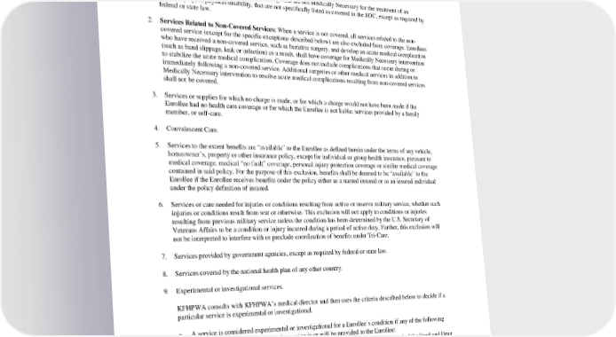 V. General Exclusions In addition to exclusions listed throughout the EOC, the following are not covered: 1. Benefits and related services, supplies and drugs that are not Medically Necessary for the treatment of an illness, injury, or physical disability, that are not specifically listed as covered in the EOC, except as required by federal or state law. 2. Services Related to Non-Covered Services: When a service is not covered, all services related to the non- covered service (except for the specific exceptions described below) are also excluded from coverage. Enrollees who have received a non-covered service, such as bariatric surgery, and develop an acute medical complication (such as band slippage, leak or infection) as a result, shall have coverage for Medically Necessary intervention to stabilize the acute medical complication. Coverage does not include complications that occur during or immediately following a non-covered service. Additional surgeries or other medical services in addition to Medically Necessary intervention to resolve acute medical complications resulting from non-covered services shall not be covered. 3. Services or supplies for which no charge is made, or for which a charge would not have been made if the Enrollee had no health care coverage or for which the Enrollee is not liable; services provided by a family member, or self-care. 4. Convalescent Care. 5. Services to the extent benefits are “available” to the Enrollee as defined herein under the terms of any vehicle, homeowner’s, property or other insurance policy, except for individual or group health insurance, pursuant to medical coverage, medical “no fault” coverage, personal injury protection coverage or similar medical coverage contained in said policy. For the purpose of this exclusion, benefits shall be deemed to be “available” to the Enrollee if the Enrollee receives benefits under the policy either as a named insured or as an insured individual under the policy definition of insured. 6. Services or care needed for injuries or conditions resulting from active or reserve military service, whether such injuries or conditions result from war or otherwise. This exclusion will not apply to conditions or injuries resulting from previous military service unless the condition has been determined by the U.S. Secretary of Veterans Affairs to be a condition or injury incurred during a period of active duty. Further, this exclusion will not be interpreted to interfere with or preclude coordination of benefits under Tri-Care. 7. Services provided by government agencies, except as required by federal or state law. 8. Services covered by the national health plan of any other country. 9. Experimental or investigational services. KFHPWA consults with KFHPWA’s medical director and then uses the criteria described below to decide if a particular service is experimental or investigational. a. A service is considered experimental or investigational for a Enrollee’s condition if any of the following statements apply to it at the time the service is or will be provided to the Enrollee: 1) The service cannot be legally marketed in the United States without the approval of the Food and Drug Administration (“FDA”) and such approval has not been granted. 2) The service is the subject of a current new drug or new device application on file with the FDA. 3) The service is the trialed agent or for delivery or measurement of the trialed agent provided as part of a qualifying Phase I or Phase II clinical trial, as the experimental or research arm of a Phase III clinical trial. PEBB_CRCOB_2024 45