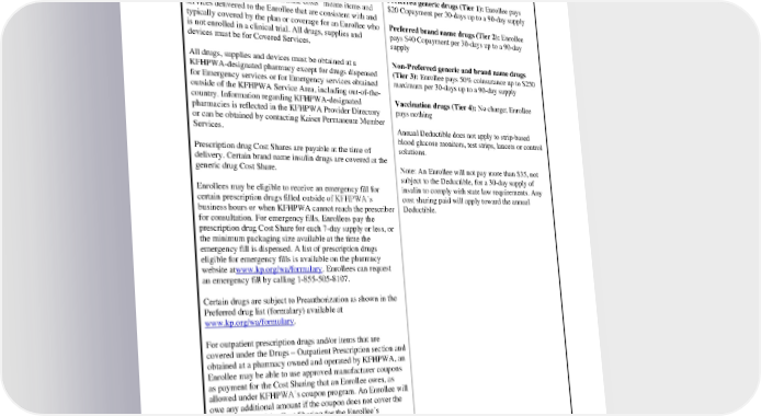 days or less including diabetic pharmacy supplies (insulin, value in treating chronic disease as determined by lancets, lancet devices, needles, insulin syringes, disposable KFHPWA (Please contact Kaiser Permanente insulin pens, pen needles and blood glucose test strips), Member Services for a list of medications): Enrollee mental health and wellness drugs, self-administered pays $5 Copayment injectables, medications for the treatment arising from sexual assault, and routine costs for prescription medications Preferred generic drugs (Tier 1): Enrollee pays provided in a clinical trial. “Routine costs” means items and $20 Copayment per 30-days up to a 90-day supply services delivered to the Enrollee that are consistent with and typically covered by the plan or coverage for an Enrollee who Preferred brand name drugs (Tier 2): Enrollee is not enrolled in a clinical trial. All drugs, supplies and pays $40 Copayment per 30-days up to a 90-day devices must be for Covered Services. supply All drugs, supplies and devices must be obtained at a Non-Preferred generic and brand name drugs KFHPWA-designated pharmacy except for drugs dispensed (Tier 3): Enrollee pays 50% coinsurance up to $250 for Emergency services or for Emergency services obtained maximum per 30-days up to a 90-day supply outside of the KFHPWA Service Area, including out-of-the- country. Information regarding KFHPWA-designated Vaccination drugs (Tier 4): No charge; Enrollee pharmacies is reflected in the KFHPWA Provider Directory pays nothing or can be obtained by contacting Kaiser Permanente Member Services. Annual Deductible does not apply to strip-based blood glucose monitors, test strips, lancets or control Prescription drug Cost Shares are payable at the time of solutions. delivery. Certain brand name insulin drugs are covered at the generic drug Cost Share. Note: An Enrollee will not pay more than $35, not subject to the Deductible, for a 30-day supply of Enrollees may be eligible to receive an emergency fill for insulin to comply with state law requirements. Any certain prescription drugs filled outside of KFHPWA’s cost sharing paid will apply toward the annual business hours or when KFHPWA cannot reach the prescriber Deductible. for consultation. For emergency fills, Enrollees pay the prescription drug Cost Share for each 7-day supply or less, or the minimum packaging size available at the time the emergency fill is dispensed. A list of prescription drugs eligible for emergency fills is available on the pharmacy website atwww.kp.org/wa/formulary. Enrollees can request an emergency fill by calling 1-855-505-8107. Certain drugs are subject to Preauthorization as shown in the Preferred drug list (formulary) available at www.kp.org/wa/formulary. For outpatient prescription drugs and/or items that are covered under the Drugs – Outpatient Prescription section and obtained at a pharmacy owned and operated by KFHPWA, an Enrollee may be able to use approved manufacturer coupons as payment for the Cost Sharing that an Enrollee owes, as allowed under KFHPWA’s coupon program. An Enrollee will owe any additional amount if the coupon does not cover the entire amount of the Cost Sharing for the Enrollee’s prescription. When an Enrollee uses an approved coupon for payment of their Cost Sharing, the coupon amount and any additional payment that you make will accumulate to their Out-of-Pocket Limit. More information is available regarding the Kaiser Permanente coupon program rules and limitations at www.kp.org/rxcoupons. PEBB_CRCOB_2024 20