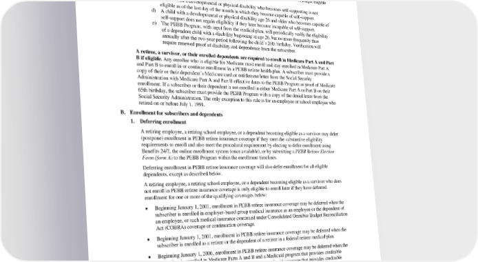 maintenance, provided such condition occurs before the age of 26. The following requirements apply to a dependent child with a disability: a) The subscriber must provide proof of the disability and dependency within 60 days of the child’s attainment of age 26. b) The subscriber must notify the PEBB Program in writing when the child is no longer eligible under this subsection. c) A child with a developmental or physical disability who becomes self-supporting is not eligible as of the last day of the month in which they become capable of self-support. d) A child with a developmental or physical disability age 26 and older who becomes capable of self-support does not regain eligibility if they later become incapable of self-support. e) The PEBB Program, with input from the medical plan, will periodically verify the eligibility of a dependent child with a disability beginning at age 26, but no more frequently than annually after the two-year period following the child’s 26th birthday. Verification will require renewed proof of disability and dependence from the subscriber. A retiree, a survivor, or their enrolled dependents are required to enroll in Medicare Part A and Part B if eligible. Any enrollee who is eligible for Medicare must enroll and stay enrolled in Medicare Part A and Part B to enroll in or continue enrollment in a PEBB retiree health plan. A subscriber must provide a copy of their or their dependent’s Medicare card or entitlement letter from the Social Security Administration with Medicare Part A and Part B effective dates to the PEBB Program as proof of Medicare enrollment. If a subscriber or their dependent is not enrolled in either Medicare Part A or Part B on their 65th birthday, the subscriber must provide the PEBB Program with a copy of the denial letter from the Social Security Administration. The only exception to this rule is for an employee or school employee who retired on or before July 1, 1991. B. Enrollment for subscribers and dependents 1. Deferring enrollment A retiring employee, a retiring school employee, or a dependent becoming eligible as a survivor may defer (postpone) enrollment in PEBB retiree insurance coverage if they meet the substantive eligibility requirements to enroll and also meet the procedural requirement by electing to defer enrollment using Benefits 24/7, the online enrollment system (once available), or by submitting a PEBB Retiree Election Form (form A) to the PEBB Program within the enrollment timelines. Deferring enrollment in PEBB retiree insurance coverage will also defer enrollment for all eligible dependents, except as described below. A retiring employee, a retiring school employee, or a dependent becoming eligible as a survivor who does not enroll in PEBB retiree insurance coverage is only eligible to enroll later if they have deferred enrollment for one or more of the qualifying coverages below: • Beginning January 1, 2001, enrollment in PEBB retiree insurance coverage may be deferred when the subscriber is enrolled in employer-based group medical insurance as an employee or the dependent of an employee, or such medical insurance continued under Consolidated Omnibus Budget Reconciliation Act (COBRA) coverage or continuation coverage. • Beginning January 1, 2001, enrollment in PEBB retiree insurance coverage may be deferred when the subscriber is enrolled as a retiree or the dependent of a retiree in a federal retiree medical plan. • Beginning January 1, 2006, enrollment in PEBB retiree insurance coverage may be deferred when the subscriber is enrolled in Medicare Parts A and B and a Medicaid program that provides creditable coverage. Eligible dependents who are not enrolled in Medicaid coverage that provides creditable coverage may be enrolled. • Beginning January 1, 2014, subscribers who are not eligible for Medicare Part A and Part B may defer enrollment in PEBB retiree insurance coverage when the subscriber is enrolled in qualified health plan coverage through a health benefit exchange developed under the Affordable Care Act. PEBB_CRCOB_2024 48