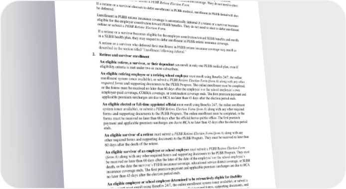 • Beginning July 17, 2018, enrollment in PEBB retiree insurance coverage may be deferred when the subscriber is enrolled in the Civilian Health and Medical Program of the Department of Veterans Affairs (CHAMPVA). Exception: A retiree may defer enrollment in PEBB retiree insurance coverage during the period of time they are enrolled as a dependent in a medical plan sponsored by PEBB or School Employees Benefits Board (SEBB), including such coverage under COBRA or continuation coverage. They do not need to elect to defer enrollment online or submit a PEBB Retiree Election Form. If a retiree or a survivor chooses to defer enrollment in PEBB medical, enrollment in PEBB dental will also be deferred. Enrollment in PEBB retiree insurance coverage is automatically deferred if a retiree or a survivor becomes eligible for the employer contribution toward PEBB benefits. They do not need to elect to defer enrollment online or submit a PEBB Retiree Election Form. If a retiree or a survivor becomes eligible for the employer contribution toward SEBB benefits and enrolls in a SEBB health plan, they may request to defer enrollment in PEBB retiree insurance coverage. A retiree or a survivor who deferred their enrollment in PEBB retiree insurance coverage may enroll as described in the section titled “Enrollment following deferral.” 2. Retiree and survivor enrollment An eligible retiree, a survivor, or their dependent can enroll in only one PEBB medical plan, even if eligibility criteria is met under two or more subscribers. An eligible retiring employee or a retiring school employee must enroll using Benefits 24/7, the online enrollment system (once available), or submit a PEBB Retiree Election Form (form A) along with any other required forms and supporting documents to the PEBB Program. The online enrollment must be completed, or the forms must be received no later than 60 days after the employee’s or the school employee’s own employer-paid coverage, COBRA coverage, or continuation coverage ends. The first premium payment and applicable premium surcharges are due to HCA no later than 45 days after the election period ends. An eligible elected or full-time appointed official must enroll using Benefits 24/7, the online enrollment system (once available), or submit a PEBB Retiree Election Form (form A) along with any other required forms and supporting documents to the PEBB Program. The online enrollment must be completed, or the forms must be received no later than 60 days after the official leaves public office. The first premium payment and applicable premium surcharges are due to HCA no later than 45 days after the election period ends. An eligible survivor of a retiree must submit a PEBB Retiree Election Form (form A) along with any other required forms and supporting documents to the PEBB Program. They must be received no later than 60 days after the death of the retiree. An eligible survivor of an employee or school employee must submit a PEBB Retiree Election Form (form A) along with any other required forms and supporting documents to the PEBB Program. They must be received no later than 60 days after the later of the date of the employee’s or the school employee’s death, or the date the survivor’s PEBB insurance coverage, educational service district coverage, or SEBB insurance coverage ends. The first premium payment and applicable premium surcharges are due to HCA no later than 45 days after the election period ends. An eligible employee or school employee determined to be retroactively eligible for disability retirement must enroll using Benefits 24/7, the online enrollment system (once available), or submit a PEBB Retiree Election Form (form A) along with any other required forms, supporting documents, and their formal determination letter to the PEBB Program. The online enrollment must be completed, or the forms must be received no later than 60 days after the date on the determination letter. The first premium payment and applicable premium surcharges are due to HCA no later than 45 days after the election period ends. PEBB_CRCOB_2024 49