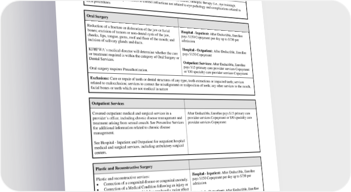 surgery, is covered only once within a 12-month period and only when needed due to a change in the Enrollee’s prescription. Replacement for loss or breakage is subject to the frames and Lenses benefit. Exclusions: Fees related to the lens fitting of non-network issued frames; orthoptic therapy (i.e., eye training); evaluations and surgical procedures to correct refractions not related to eye pathology and complications related to such procedures Oral Surgery Reduction of a fracture or dislocation of the jaw or facial Hospital - Inpatient: After Deductible, Enrollee bones; excision of tumors or non-dental cysts of the jaw, pays $150 Copayment per day up to $750 per cheeks, lips, tongue, gums, roof and floor of the mouth; and admission incision of salivary glands and ducts. Hospital - Outpatient: After Deductible, Enrollee KFHPWA’s medical director will determine whether the care pays $150 Copayment or treatment required is within the category of Oral Surgery or Dental Services. Outpatient Services: After Deductible, Enrollee pays $15 primary care provider services Copayment Oral surgery requires Preauthorization. or $30 specialty care provider services Copayment Exclusions: Care or repair of teeth or dental structures of any type; tooth extractions or impacted teeth; services related to malocclusion; services to correct the misalignment or malposition of teeth; any other services to the mouth, facial bones or teeth which are not medical in nature Outpatient Services Covered outpatient medical and surgical services in a After Deductible, Enrollee pays $15 primary care provider’s office, including chronic disease management and provider services Copayment or $30 specialty care treatment arising from sexual assault. See Preventive Services provider services Copayment for additional information related to chronic disease management. See Hospital - Inpatient and Outpatient for outpatient hospital medical and surgical services, including ambulatory surgical centers. Plastic and Reconstructive Surgery Plastic and reconstructive services: Hospital - Inpatient: After Deductible, Enrollee • Correction of a congenital disease or congenital anomaly. pays $150 Copayment per day up to $750 per • Correction of a Medical Condition following an injury or admission resulting from surgery which has produced a major effect on the Enrollee’s appearance, when in the opinion of Hospital - Outpatient: After Deductible, Enrollee KFHPWA’s medical director such services can pays $150 Copayment reasonably be expected to correct the condition. • Reconstructive surgery and associated procedures, Outpatient Services: After Deductible, Enrollee including internal breast prostheses, following a pays $15 primary care provider services Copayment mastectomy, regardless of when the mastectomy was or $30 specialty care provider services Copayment PEBB_CRCOB_2024 35