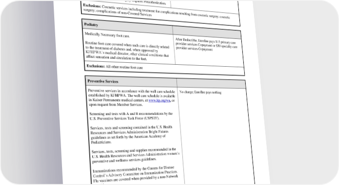 performed. Enrollees are covered for all stages of reconstruction on the non-diseased breast to produce a symmetrical appearance. Complications of covered mastectomy services, including lymphedemas, are covered. Plastic and reconstructive surgery requires Preauthorization. Exclusions: Cosmetic services including treatment for complications resulting from cosmetic surgery; cosmetic surgery; complications of non-Covered Services Podiatry Medically Necessary foot care. After Deductible, Enrollee pays $15 primary care provider services Copayment or $30 specialty care Routine foot care covered when such care is directly related provider services Copayment to the treatment of diabetes and, when approved by KFHPWA’s medical director, other clinical conditions that affect sensation and circulation to the feet. Exclusions: All other routine foot care Preventive Services Preventive services in accordance with the well care schedule No charge; Enrollee pays nothing established by KFHPWA. The well care schedule is available in Kaiser Permanente medical centers, at www.kp.org/wa, or upon request from Member Services. Screening and tests with A and B recommendations by the U.S. Preventive Services Task Force (USPSTF). Services, tests and screening contained in the U.S. Health Resources and Services Administration Bright Futures guidelines as set forth by the American Academy of Pediatricians. Services, tests, screening and supplies recommended in the U.S. Health Resources and Services Administration women’s preventive and wellness services guidelines. Immunizations recommended by the Centers for Disease Control’s Advisory Committee on Immunization Practices. Flu vaccines are covered when provided by a non-Network Provider. Preventive services include, but are not limited to, well adult and well child physical examinations; immunizations and vaccinations; preferred over-the-counter drugs as recommended by the USPSTF when obtained with a prescription; preventive services related to preconception, prenatal and postpartum care; routine mammography PEBB_CRCOB_2024 36
