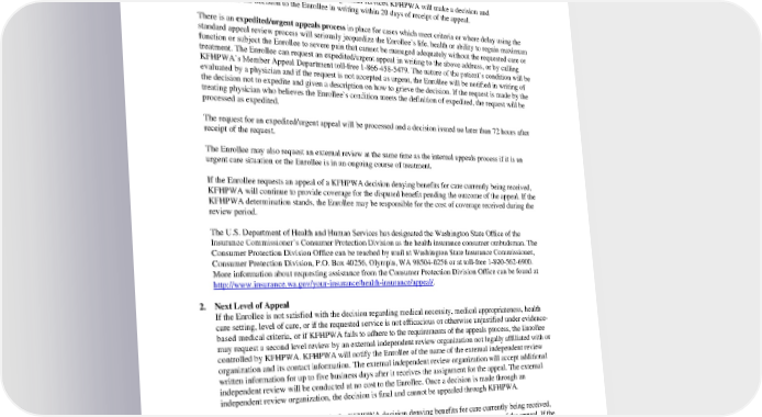 A party not involved in the initial coverage determination and not a subordinate of the party making the initial coverage determination will review the appeal request. KFHPWA will then notify the Enrollee of its determination or need for an extension of time within 14 days of receiving the request for appeal. Under no circumstances will the review timeframe exceed 30 days without the Enrollee’s written permission. For appeals involving experimental or investigational services KFHPWA will make a decision and communicate the decision to the Enrollee in writing within 20 days of receipt of the appeal. There is an expedited/urgent appeals process in place for cases which meet criteria or where delay using the standard appeal review process will seriously jeopardize the Enrollee’s life, health or ability to regain maximum function or subject the Enrollee to severe pain that cannot be managed adequately without the requested care or treatment. The Enrollee can request an expedited/urgent appeal in writing to the above address, or by calling KFHPWA’s Member Appeal Department toll-free 1-866-458-5479. The nature of the patient’s condition will be evaluated by a physician and if the request is not accepted as urgent, the Enrollee will be notified in writing of the decision not to expedite and given a description on how to grieve the decision. If the request is made by the treating physician who believes the Enrollee’s condition meets the definition of expedited, the request will be processed as expedited. The request for an expedited/urgent appeal will be processed and a decision issued no later than 72 hours after receipt of the request. The Enrollee may also request an external review at the same time as the internal appeals process if it is an urgent care situation or the Enrollee is in an ongoing course of treatment. If the Enrollee requests an appeal of a KFHPWA decision denying benefits for care currently being received, KFHPWA will continue to provide coverage for the disputed benefit pending the outcome of the appeal. If the KFHPWA determination stands, the Enrollee may be responsible for the cost of coverage received during the review period. The U.S. Department of Health and Human Services has designated the Washington State Office of the Insurance Commissioner’s Consumer Protection Division as the health insurance consumer ombudsman. The Consumer Protection Division Office can be reached by mail at Washington State Insurance Commissioner, Consumer Protection Division, P.O. Box 40256, Olympia, WA 98504-0256 or at toll-free 1-800-562-6900. More information about requesting assistance from the Consumer Protection Division Office can be found at http://www.insurance.wa.gov/your-insurance/health-insurance/appeal/. 2. Next Level of Appeal If the Enrollee is not satisfied with the decision regarding medical necessity, medical appropriateness, health care setting, level of care, or if the requested service is not efficacious or otherwise unjustified under evidence- based medical criteria, or if KFHPWA fails to adhere to the requirements of the appeals process, the Enrollee may request a second level review by an external independent review organization not legally affiliated with or controlled by KFHPWA. KFHPWA will notify the Enrollee of the name of the external independent review organization and its contact information. The external independent review organization will accept additional written information for up to five business days after it receives the assignment for the appeal. The external independent review will be conducted at no cost to the Enrollee. Once a decision is made through an independent review organization, the decision is final and cannot be appealed through KFHPWA. If the Enrollee requests an appeal of a KFHPWA decision denying benefits for care currently being received, KFHPWA will continue to provide coverage for the disputed benefit pending the outcome of the appeal. If the KFHPWA determination stands, the Enrollee may be responsible for the cost of coverage received during the review period. A request for a review by an independent review organization must be made within 180 days after the date of the initial appeal decision notice. PEBB_CRCOB_2024 61