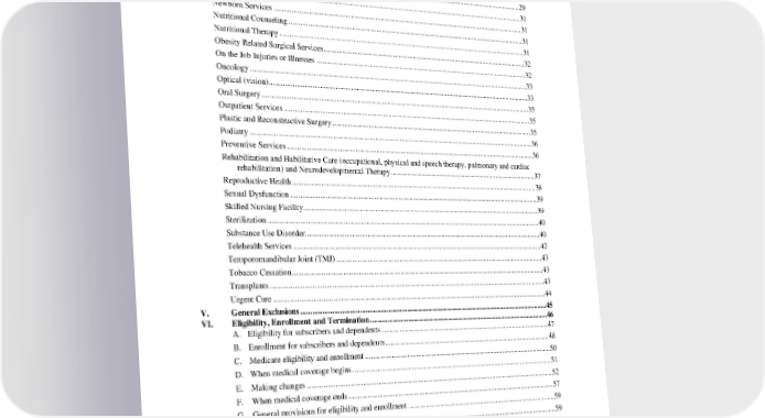Laboratory and Radiology ............................................................................................................................. 28 Manipulative Therapy ................................................................................................................................... 28 Massage Therapy ........................................................................................................................................... 28 Maternity and Pregnancy ............................................................................................................................... 29 Mental Health and Wellness .......................................................................................................................... 29 Naturopathy ................................................................................................................................................... 31 Newborn Services ......................................................................................................................................... 31 Nutritional Counseling .................................................................................................................................. 31 Nutritional Therapy ....................................................................................................................................... 31 Obesity Related Surgical Services................................................................................................................. 32 On the Job Injuries or Illnesses ..................................................................................................................... 32 Oncology ....................................................................................................................................................... 33 Optical (vision) .............................................................................................................................................. 33 Oral Surgery .................................................................................................................................................. 35 Outpatient Services ....................................................................................................................................... 35 Plastic and Reconstructive Surgery ............................................................................................................... 35 Podiatry ......................................................................................................................................................... 36 Preventive Services ....................................................................................................................................... 36 Rehabilitation and Habilitative Care (occupational, physical and speech therapy, pulmonary and cardiac rehabilitation) and Neurodevelopmental Therapy .................................................................................. 37 Reproductive Health ...................................................................................................................................... 38 Sexual Dysfunction ....................................................................................................................................... 39 Skilled Nursing Facility................................................................................................................................. 39 Sterilization ................................................................................................................................................... 40 Substance Use Disorder................................................................................................................................. 40 Telehealth Services ....................................................................................................................................... 42 Temporomandibular Joint (TMJ) .................................................................................................................. 43 Tobacco Cessation ......................................................................................................................................... 43 Transplants .................................................................................................................................................... 43 Urgent Care ................................................................................................................................................... 44 V. General Exclusions ...................................................................................................................................... 45 VI. Eligibility, Enrollment and Termination ................................................................................................... 46 A. Eligibility for subscribers and dependents ............................................................................................. 47 B. Enrollment for subscribers and dependents ............................................................................................ 48 C. Medicare eligibility and enrollment ....................................................................................................... 50 D. When medical coverage begins .............................................................................................................. 51 E. Making changes ..................................................................................................................................... 52 F. When medical coverage ends ................................................................................................................. 57 G. General provisions for eligibility and enrollment .................................................................................. 59 H. Appeal ri