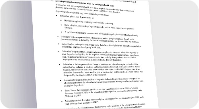 • If a subscriber wants to enroll a newborn or child whom the subscriber has adopted or has assumed a legal obligation for total or partial support in anticipation of adoption, the subscriber should complete the request online or notify the PEBB Program by submitting the required form(s) as soon as possible to ensure timely payment of claims. If adding the child increases the premium, the request must be received online, or the required form(s) must be received no later than 60 days after the date of the birth, adoption, or the date the legal obligation is assumed for total or partial support in anticipation of adoption. 8. Special open enrollment events that allow for a change in health plans A subscriber may not change their health plan during a special open enrollment if their state-registered domestic partner or state-registered domestic partner’s child is not a tax dependent. Any of the following events may create a special open enrollment: • Subscriber gains a new dependent due to: o Marriage or registering a state-registered domestic partnership. o Birth, adoption, or assuming a legal obligation for total or partial support in anticipation of adoption. o A child becoming eligible as an extended dependent through legal custody or legal guardianship. • Subscriber or their dependent loses other coverage under a group health plan or through health insurance coverage, as defined by the Health Insurance Portability and Accountability Act (HIPAA). • Subscriber has a change in employment status that affects their eligibility for the employer contribution toward their employer-based group health plan. • Subscriber’s dependent has a change in their own employment status that affects their eligibility or their dependent’s eligibility for the employer contribution under their employer-based group health plan. “Employer contribution” means contributions made by the dependent’s current or former employer toward health coverage as described in the Treasury Regulation. • Subscriber or their dependent has a change in residence that affects health plan availability. If the subscriber has a change in residence and their current medical plan is no longer available in the new location, the subscriber must select a new medical plan as described in PEBB Program rules. If the subscriber does not elect a new medical plan as required, they will be enrolled in a PEBB medical plan designated by the director of HCA or their designee. • A court order requires the subscriber or any other individual to provide insurance coverage for an eligible dependent of the subscriber (a former spouse or former state-registered domestic partner is not an eligible dependent). • Subscriber or their dependent enrolls in coverage under Medicaid or a state Children’s Health Insurance Program (CHIP), or the subscriber or their dependent loses eligibility for coverage under Medicaid or CHIP. • Subscriber or their dependent becomes eligible for state premium assistance subsidy for PEBB health plan coverage from Medicaid or CHIP. • Subscriber or their dependent enrolls in coverage under Medicare, or the subscriber or their dependent loses eligibility for coverage under Medicare or enrolls in or terminates enrollment in a Medicare Advantage-Prescription Drug or a Part D plan. If the subscriber’s current medical plan becomes unavailable due to the subscriber or their dependents enrollment in Medicare, the subscriber must select a new medical plan. • Subscriber or their dependent’s current medical plan becomes unavailable because the subscriber or enrolled dependent is no longer eligible for a health savings account (HSA). PEBB_CRCOB_2024 55