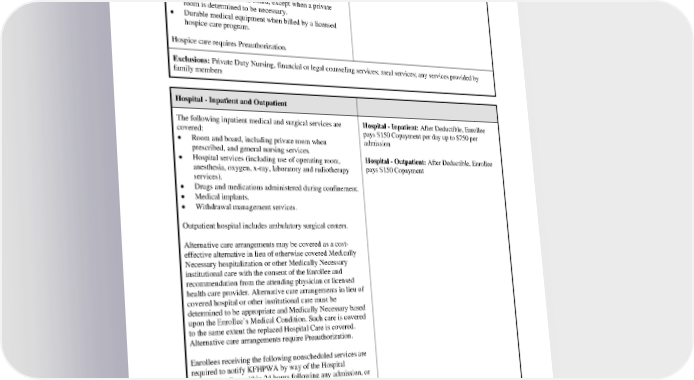 consecutive days per 3-month period of hospice care. Other covered hospice services, when billed by a licensed hospice program, may include the following: • Inpatient and outpatient services and supplies for injury and illness. • Semi-private room and board, except when a private room is determined to be necessary. • Durable medical equipment when billed by a licensed hospice care program. Hospice care requires Preauthorization. Exclusions: Private Duty Nursing, financial or legal counseling services; meal services; any services provided by family members Hospital - Inpatient and Outpatient The following inpatient medical and surgical services are Hospital - Inpatient: After Deductible, Enrollee covered: pays $150 Copayment per day up to $750 per • Room and board, including private room when admission prescribed, and general nursing services. • Hospital services (including use of operating room, Hospital - Outpatient: After Deductible, Enrollee anesthesia, oxygen, x-ray, laboratory and radiotherapy pays $150 Copayment services). • Drugs and medications administered during confinement. • Medical implants. • Withdrawal management services. Outpatient hospital includes ambulatory surgical centers. Alternative care arrangements may be covered as a cost- effective alternative in lieu of otherwise covered Medically Necessary hospitalization or other Medically Necessary institutional care with the consent of the Enrollee and recommendation from the attending physician or licensed health care provider. Alternative care arrangements in lieu of covered hospital or other institutional care must be determined to be appropriate and Medically Necessary based upon the Enrollee’s Medical Condition. Such care is covered to the same extent the replaced Hospital Care is covered. Alternative care arrangements require Preauthorization. Enrollees receiving the following nonscheduled services are required to notify KFHPWA by way of the Hospital notification line within 24 hours following any admission, or as soon thereafter as medically possible: acute withdrawal management services, Emergency psychiatric services, Emergency services, labor and delivery and inpatient admissions needed for treatment of Urgent Conditions that cannot reasonably be delayed until Preauthorization can be obtained. PEBB_CRCOB_2024 26