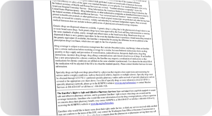 may include requests to cover non-preferred drugs, obtain Preauthorization for a specific drug, or exceptions to other utilization management requirements, such as quantity limits. Prescription drugs are drugs which have been approved by the Food and Drug Administration (FDA) and which can, under federal or state law, be dispensed only pursuant to a prescription order. These drugs, including off-label use of FDA-approved drugs (provided that such use is documented to be effective in one of the standard reference compendia; a majority of well-designed clinical trials published in peer-reviewed medical literature document improved efficacy or safety of the agent over standard therapies, or over placebo if no standard therapies exist; or by the federal secretary of Health and Human Services) are covered. “Standard reference compendia” means the American Hospital Formulary Service – Drug Information; the American Medical Association Drug Evaluation; the United States Pharmacopoeia – Drug Information, or other authoritative compendia as identified from time to time by the federal secretary of Health and Human Services. “Peer-reviewed medical literature” means scientific studies printed in health care journals or other publications in which original manuscripts are published only after having been critically reviewed for scientific accuracy, validity and reliability by unbiased independent experts. Peer-reviewed medical literature does not include in-house publications of pharmaceutical manufacturing companies. Generic drugs are dispensed whenever available. A generic drug is a drug that is the pharmaceutical equivalent to one or more brand name drugs. Such generic drugs have been approved by the Food and Drug Administration as meeting the same standards of safety, purity, strength and effectiveness as the brand name drug. Brand name drugs are dispensed if there is not a generic equivalent. In the event the Enrollee elects to purchase a brand-name drug instead of the generic equivalent (if available), the Enrollee is responsible for paying the difference in cost in addition to the prescription drug Cost Share, which does not apply to the Out-of-pocket Limit. Drug coverage is subject to utilization management that includes Preauthorization, step therapy (when an Enrollee tries a certain medication before receiving coverage for a similar, but non-Preferred medication), limits on drug quantity or days supply and prevention of overutilization, underutilization, therapeutic duplication, drug-drug interactions, incorrect drug dosage, drug-allergy contraindications and clinical abuse/misuse of drugs. If an Enrollee has a new prescription for a chronic condition, the Enrollee may request a coordination of medications so that medications for chronic conditions are refilled on the same schedule (synchronized). Cost-shares for the initial fill of the medication will be adjusted if the fill is less than the standard quantity. Please contact Member Services for more information. Specialty drugs are high-cost drugs prescribed by a physician that requires close supervision and monitoring for serious and/or complex conditions, such as rheumatoid arthritis, hepatitis or multiple sclerosis. Specialty drugs must be obtained through KFHPWA’s preferred specialty pharmacy vendor and/or network of specialty pharmacies and are covered at the appropriate cost share above. For a list of specialty drugs or more information about KFHPWA’s specialty pharmacy network, please go to the KFHPWA website at www.kp.org/wa/formulary or contact Member Services at 206-630-0107 or toll-free at 1-866-648-1928. The Enrollee’s Right to Safe and Effective Pharmacy Services: State and federal laws establish standards to assure safe and effective pharmacy services, and to guarantee Enrollees’ right to know what drugs are covered and the coverage limitations. Enrollees who would like more information about the drug coverage policies, or have a question or concern about their pharmacy benefit, may contact KFHPWA at 206-630-0107 or toll-free 1-866-648-1928 or by accessing the KFHPWA website at www.kp.org/wa/formulary. Enrollees who would like to know more about their rights under the law, or think any services received while enrolled may not conform to the terms of the EOC, may contact the Washington State Office of Insurance Commissioner at toll-free 1-800-562-6900. Enrollees who have a concern about the pharmacists or pharmacies serving them may call the Washington State Department of Health at toll-free 1-800-525-0127. Prescription Drug Coverage and Medicare: This benefit, for purposes of Creditable Coverage, is actuarially equal to or greater than the Medicare Part D prescription drug benefit. Enrollees who are also eligible for Medicare Part D can remain covered and will not be subject to Medicare-imposed late enrollment penalties should they decide to enroll in a Medicare Part D plan at a later date; however, the Enrollee could be subject to payment of higher Part D premiums if the Enrollee subsequently has a break in creditable coverage of 63 continuous days or longer before PEBB_CRCOB_2024 22