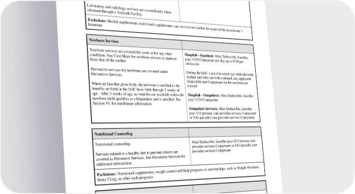 Naturopathy Naturopathy. After Deductible, Enrollee pays $15 primary care provider services Copayment Limited to 3 visits per medical diagnosis per calendar year without Preauthorization. Additional visits are covered with Preauthorization. Laboratory and radiology services are covered only when obtained through a Network Facility. Exclusions: Herbal supplements; nutritional supplements; any services not within the scope of the practitioner’s licensure Newborn Services Newborn services are covered the same as for any other Hospital – Inpatient: After Deductible, Enrollee condition. Any Cost Share for newborn services is separate pays $150 Copayment per day up to $750 per from that of the mother. admission Preventive services for newborns are covered under During the baby’s initial hospital stay while the birth Preventive Services. mother and baby are both confined, any applicable Deductible and Copayment for the newborn are When an Enrollee gives birth, the newborn is entitled to the waived benefits set forth in the EOC from birth through 3 weeks of age. After 3 weeks of age, no benefits are available unless the Hospital – Outpatient: After Deductible, Enrollee newborn child qualifies as a Dependent and is enrolled. See pays $150 Copayment Section VI. for enrollment information. Outpatient Services: After Deductible, Enrollee pays $15 primary care provider services Copayment or $30 specialty care provider services Copayment Nutritional Counseling Nutritional counseling. After Deductible, Enrollee pays $15 primary care provider services Copayment or $30 specialty care Services related to a healthy diet to prevent obesity are provider services Copayment covered as Preventive Services. See Preventive Services for additional information. Exclusions: Nutritional supplements; weight control self-help programs or memberships, such as Weight Watchers, Jenny Craig, or other such programs Nutritional Therapy Medical formula necessary for the treatment of After Deductible, Enrollee pays nothing phenylketonuria (PKU), specified inborn errors of metabolism, or other metabolic disorders. Enteral therapy is covered when Medical Necessity criteria After Deductible, Enrollee pays 20% coinsurance are met and when given through a PEG, J tube, or orally or PEBB_CRCOB_2024 31