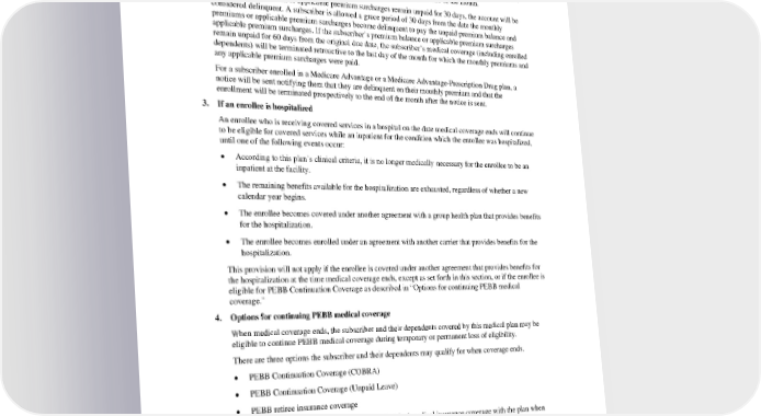 A subscriber will be responsible for payment of any services received after the date medical coverage ends as described above. 2. Final premium payments Premium payments and applicable premium surcharges are not prorated during any month, for any reason, even if an enrollee dies or asks to terminate their medical plan before the end of the month. If the monthly premium or applicable premium surcharges remain unpaid for 30 days, the account will be considered delinquent. A subscriber is allowed a grace period of 30 days from the date the monthly premiums or applicable premium surcharges become delinquent to pay the unpaid premium balance and applicable premium surcharges. If the subscriber’s premium balance or applicable premium surcharges remain unpaid for 60 days from the original due date, the subscriber’s medical coverage (including enrolled dependents) will be terminated retroactive to the last day of the month for which the monthly premiums and any applicable premium surcharges were paid. For a subscriber enrolled in a Medicare Advantage or a Medicare Advantage-Prescription Drug plan, a notice will be sent notifying them that they are delinquent on their monthly premium and that the enrollment will be terminated prospectively to the end of the month after the notice is sent. 3. If an enrollee is hospitalized An enrollee who is receiving covered services in a hospital on the date medical coverage ends will continue to be eligible for covered services while an inpatient for the condition which the enrollee was hospitalized, until one of the following events occur: • According to this plan’s clinical criteria, it is no longer medically necessary for the enrollee to be an inpatient at the facility. • The remaining benefits available for the hospitalization are exhausted, regardless of whether a new calendar year begins. • The enrollee becomes covered under another agreement with a group health plan that provides benefits for the hospitalization. • The enrollee becomes enrolled under an agreement with another carrier that provides benefits for the hospitalization. This provision will not apply if the enrollee is covered under another agreement that provides benefits for the hospitalization at the time medical coverage ends, except as set forth in this section, or if the enrollee is eligible for PEBB Continuation Coverage as described in “Options for continuing PEBB medical coverage.” 4. Options for continuing PEBB medical coverage When medical coverage ends, the subscriber and their dependents covered by this medical plan may be eligible to continue PEBB medical coverage during temporary or permanent loss of eligibility. There are three options the subscriber and their dependents may qualify for when coverage ends. • PEBB Continuation Coverage (COBRA) • PEBB Continuation Coverage (Unpaid Leave) • PEBB retiree insurance coverage A subscriber also has the right to convert to individual medical insurance coverage with the plan when continuation of group medical insurance coverage is no longer possible. (a) PEBB Continuation Coverage The PEBB Program administers the following continuation coverage options to temporarily extend group insurance coverage when the enrollee’s PEBB medical plan coverage ends due to a qualifying event: PEBB_SCA_2024 60