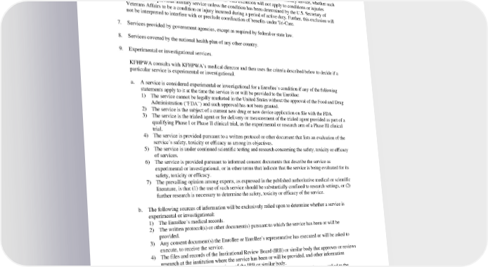 medical coverage, medical “no fault” coverage, personal injury protection coverage or similar medical coverage contained in said policy. For the purpose of this exclusion, benefits shall be deemed to be “available” to the Enrollee if the Enrollee receives benefits under the policy either as a named insured or as an insured individual under the policy definition of insured. 6. Services or care needed for injuries or conditions resulting from active or reserve military service, whether such injuries or conditions result from war or otherwise. This exclusion will not apply to conditions or injuries resulting from previous military service unless the condition has been determined by the U.S. Secretary of Veterans Affairs to be a condition or injury incurred during a period of active duty. Further, this exclusion will not be interpreted to interfere with or preclude coordination of benefits under Tri-Care. 7. Services provided by government agencies, except as required by federal or state law. 8. Services covered by the national health plan of any other country. 9. Experimental or investigational services. KFHPWA consults with KFHPWA’s medical director and then uses the criteria described below to decide if a particular service is experimental or investigational. a. A service is considered experimental or investigational for a Enrollee’s condition if any of the following statements apply to it at the time the service is or will be provided to the Enrollee: 1) The service cannot be legally marketed in the United States without the approval of the Food and Drug Administration (“FDA”) and such approval has not been granted. 2) The service is the subject of a current new drug or new device application on file with the FDA. 3) The service is the trialed agent or for delivery or measurement of the trialed agent provided as part of a qualifying Phase I or Phase II clinical trial, as the experimental or research arm of a Phase III clinical trial. 4) The service is provided pursuant to a written protocol or other document that lists an evaluation of the service’s safety, toxicity or efficacy as among its objectives. 5) The service is under continued scientific testing and research concerning the safety, toxicity or efficacy of services. 6) The service is provided pursuant to informed consent documents that describe the service as experimental or investigational, or in other terms that indicate that the service is being evaluated for its safety, toxicity or efficacy. 7) The prevailing opinion among experts, as expressed in the published authoritative medical or scientific literature, is that (1) the use of such service should be substantially confined to research settings, or (2) further research is necessary to determine the safety, toxicity or efficacy of the service. b. The following sources of information will be exclusively relied upon to determine whether a service is experimental or investigational: 1) The Enrollee’s medical records. 2) The written protocol(s) or other document(s) pursuant to which the service has been or will be provided. 3) Any consent document(s) the Enrollee or Enrollee’s representative has executed or will be asked to execute, to receive the service. 4) The files and records of the Institutional Review Board (IRB) or similar body that approves or reviews research at the institution where the service has been or will be provided, and other information concerning the authority or actions of the IRB or similar body. 5) The published authoritative medical or scientific literature regarding the service, as applied to the Enrollee’s illness or injury. 6) Regulations, records, applications and any other documents or actions issued by, filed with or taken by, the FDA or other agencies within the United States Department of Health and Human Services, or any state agency performing similar functions. PEBB_SCA_2024 47