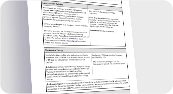 • Hydration. • Chemotherapy. • Pain management. Preauthorization is required. Laboratory and Radiology Nuclear medicine, radiology, ultrasound and laboratory After Deductible, Enrollee pays 15% Plan services. including high end radiology imaging services such Coinsurance as CAT scan, MRI and PET which are subject to Preauthorization except when associated with Emergency Urine Drug Screening: Enrollee pays nothing. services or inpatient services. Please contact Member Limited to 2 tests per calendar year. Benefits are Services for any questions regarding these services. applied in the order claims are received and processed. After allowance: After Deductible, Services received as part of an emergency visit are covered as Enrollee pays 15% Plan Coinsurance Emergency Services. Breast Exam: Enrollee pays nothing Preventive laboratory and radiology services are covered in accordance with the well care schedule established by KFHPWA and the Patient Protection and Affordable Care Act of 2010. The well care schedule is available in Kaiser Permanente medical centers, at www.kp.org/wa, or upon request from Member Services. Manipulative Therapy Manipulative therapy of the spine and extremities when in Enrollee pays $20 Copayment for primary care accordance with KFHPWA clinical criteria, limited to a total provider office visits of 24 visits per calendar year. Preauthorization is not required. After Deductible, Enrollee pays 15% Plan Coinsurance for specialty care provider office visits Rehabilitation services, such as massage or physical therapy, provided with manipulations is covered under the Massage Therapy or Rehabilitation and Habilitative Care (occupational, physical and speech therapy, pulmonary and cardiac rehabilitation) and Neurodevelopmental Therapy section. Exclusions: Supportive care rendered primarily to maintain the level of correction already achieved; care rendered primarily for the convenience of the Enrollee; care rendered on a non-acute, asymptomatic basis; charges for any other services that do not meet KFHPWA clinical criteria as Medically Necessary Massage Therapy Massage therapy when in accordance with KFHPWA clinical After Deductible, Enrollee pays 15% Plan criteria, limited to a total of 24 visits per calendar year. Coinsurance for specialty care provider office visits PEBB_SCA_2024 29