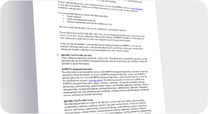 family member. For information on how to select or change Network Personal Physicians, and for a list of participating personal physicians, call the Kaiser Permanente Member Services at (206) 630-0107 in the Seattle area, or toll-free in Washington at 1-866-648-1928 or by accessing the KFHPWA website at www.kp.org/wa. The change will be made within 24 hours of the receipt of the request if the selected physician’s caseload permits. If a personal physician accepting new Enrollees is not available in your area, contact the Kaiser Permanente Member Services, who will ensure you have access to a personal physician by contacting a physician’s office to request they accept new Enrollees. To find a personal physician, contact Member Services or access the KFHPWA website at www.kp.org/wa to view physician profiles. Online you will find information on each physician’s location, education, credentials, and specialties. For your personal physician, choose from these specialties: • Family medicine • Adult medicine/internal medicine • Pediatrics/adolescent medicine (for children up to 18) Be sure to check that the physician you are considering is accepting new patients. If your choice does not feel right after a few visits, you can change personal physician at any time, for any reason. If you don’t choose a physician when you first become a KFHPWA Enrollee, we will match you with a physician to make sure you have one assigned to you if you get sick or injured. In the case that the Enrollee’s personal physician no longer participates in KFHPWA’s network, the Enrollee will be provided access to the personal physician for up to 60 days following a written notice offering the Enrollee a selection of new personal physicians from which to choose. 3. Specialty Care Provider Services. Unless otherwise indicated in Section II. or Section IV., Preauthorization is required for specialty care and specialists that are not KFHPWA-designated Specialists and are not providing care at facilities owned and operated by Kaiser Permanente. KFHPWA-designated Specialist. Preauthorization is not required for services with KFHPWA-designated Specialists at facilities owned and operated by Kaiser Permanente. To access a KFHPWA-designated Specialist, consult your KFHPWA personal physician. For a list of KFHPWA-designated Specialists, contact Member Services or view the Provider Directory located at www.kp.org/wa. The following specialty care areas are available from KFHPWA-designated Specialists: allergy, audiology, cardiology, chiropractic/manipulative therapy, dermatology, gastroenterology, general surgery, hospice, mental health, nephrology, neurology, obstetrics and gynecology, occupational medicine, oncology/hematology, ophthalmology, optometry, orthopedics, otolaryngology (ear, nose and throat), physical therapy, smoking cessation, speech/language and learning services, substance use disorder and urology. Specialty Care Provider Level. The following providers are subject to the Specialty Care Provider level: allergy and immunology, anesthesiology, audiology, cardiology (pediatric and cardiovascular disease), critical care medicine, dentistry, dermatology, endocrinology, enterostomal therapy, gastroenterology, genetics, hepatology, infectious disease, massage therapy, neonatal-perinatal medicine, nephrology, neurology, nutrition, occupational medicine, occupational therapy, hematology/oncology, oncology pharmacist, ophthalmology, orthopedics, ENT/otolaryngology, pathology, pain management, physiatry (physical medicine), physical therapy, podiatry, pulmonary medicine/disease, radiology (nuclear medicine, radiation therapy), respiratory therapy, rheumatology, speech therapy, sports medicine, general surgery and urology. 4. Hospital Services. Non-Emergency inpatient hospital services require Preauthorization. Refer to Section IV. for more information about hospital services. PEBB_SCA_2024 7