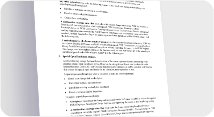 • Enroll after waiving medical plan enrollment • Enroll or remove eligible dependents An employee must submit the election change online using PEBB My Account or Benefits 24/7 (once available) or submit the required PEBB Employee Enrollment/Change form and any supporting documents to their employing agency. The change must be completed online or the forms received no later than the last day of the annual open enrollment period and will be effective January 1 of the following year. Any other subscriber may make the following changes to their enrollment during the PEBB Program’s annual open enrollment period: • Enroll in or terminate enrollment in a medical plan • Enroll or remove eligible dependents • Change their medical plan A continuation coverage subscriber must submit the election change online using PEBB My Account or Benefits 24/7 (once available) or submit the required PEBB Continuation Coverage (COBRA) Election/Change, or PEBB Continuation Coverage (Unpaid Leave) Election/Change form (as appropriate) and any supporting documents to the PEBB Program. The change must be completed online, or the forms received, no later than the last day of the annual open enrollment period and will be effective January 1 of the following year. A retired employee of a former employer group must submit the election change online using PEBB My Account or Benefits 24/7 (once available) or submit the required PEBB Continuation Coverage (Employer Group Ended Participation) Election/Change form and any supporting documents to the PEBB Program. The change must be completed online, or the forms received, no later than the last day of the annual open enrollment period and will be effective January 1 of the following year. 5. Special Open Enrollment changes. A subscriber may change their enrollment outside of the annual open enrollment if a qualifying event creates a special open enrollment period. However, the change in enrollment must be allowable under Internal Revenue Code (IRC) and Treasury Regulations and correspond to and be consistent with the event that creates the special open enrollment for the subscriber, their dependent, or both. A special open enrollment may allow a subscriber to make the following changes: Enroll in or change their medical plan • Waive their medical plan enrollment • Enroll after waiving medical plan enrollment • Enroll or remove eligible dependents • To request a special open enrollment: • An employee must make the change online using Benefits 24/7 (once available) or submit the required PEBB Employee Enrollment/Change form and any supporting documents to their employing agency. • A continuation coverage subscriber must make the change online using Benefits 24/7 (once available) or submit the required PEBB Continuation Coverage (COBRA) Election/Change, or PEBB Continuation Coverage (Unpaid Leave) Election/Change form (as appropriate) and any supporting documents to the PEBB Program. • A retired employee of a former employer group must make the change online using Benefits 24/7 (once available) or submit the required PEBB Continuation Coverage (Employer Group Ended Participation) Election/Change form and any supporting documents to the PEBB Program. The change must be completed online, or the forms must be received, no later than 60 days after the event that creates the special open enrollment. In addition, the PEBB Program or the employing agency will PEBB_SCA_2024 55
